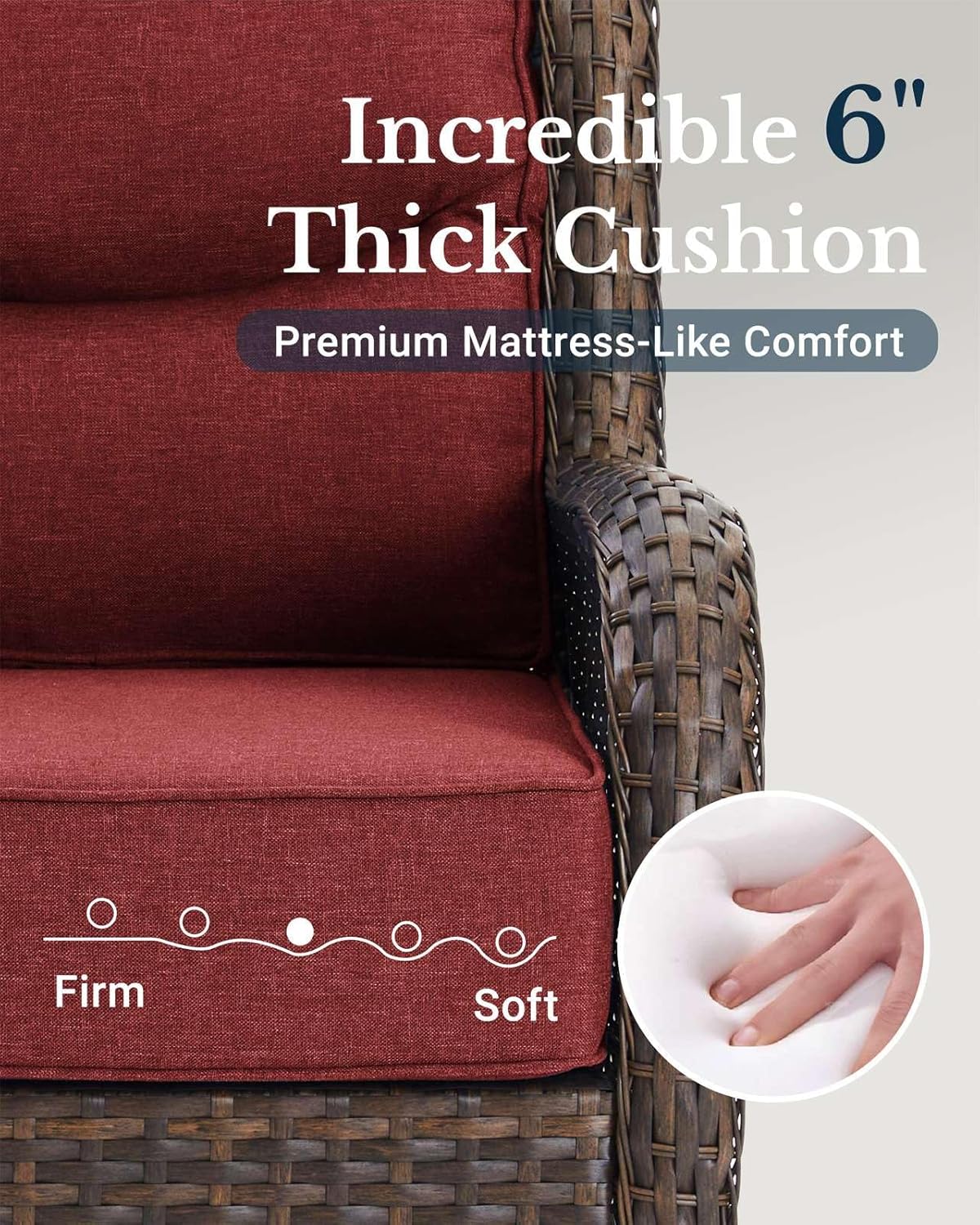 - 6-Inch Extra Thick Seat Cushion: Each cushion of our patio swivel chair and sofa is made of 6-Inch thick, 28D high-density foam—up to 40% more cushioning depth, 30% better bounce-back and 2x the durability than 4-Inch of most outdoor sets. Sit back, feel the lasting difference
