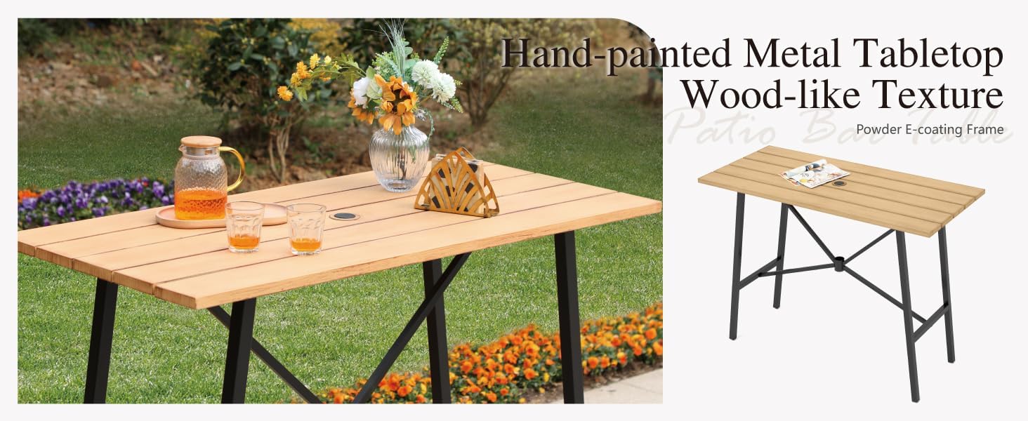 - 【Barheight Patio Table and Chairs】Combines ergonomic high back design with seamless swivel functionality, this bar set provides a stylish and elevated seating option that adds flair to any space. Patio bar table features a handpainted tabletop with woodlike texture. Umbrella hole: 1.57