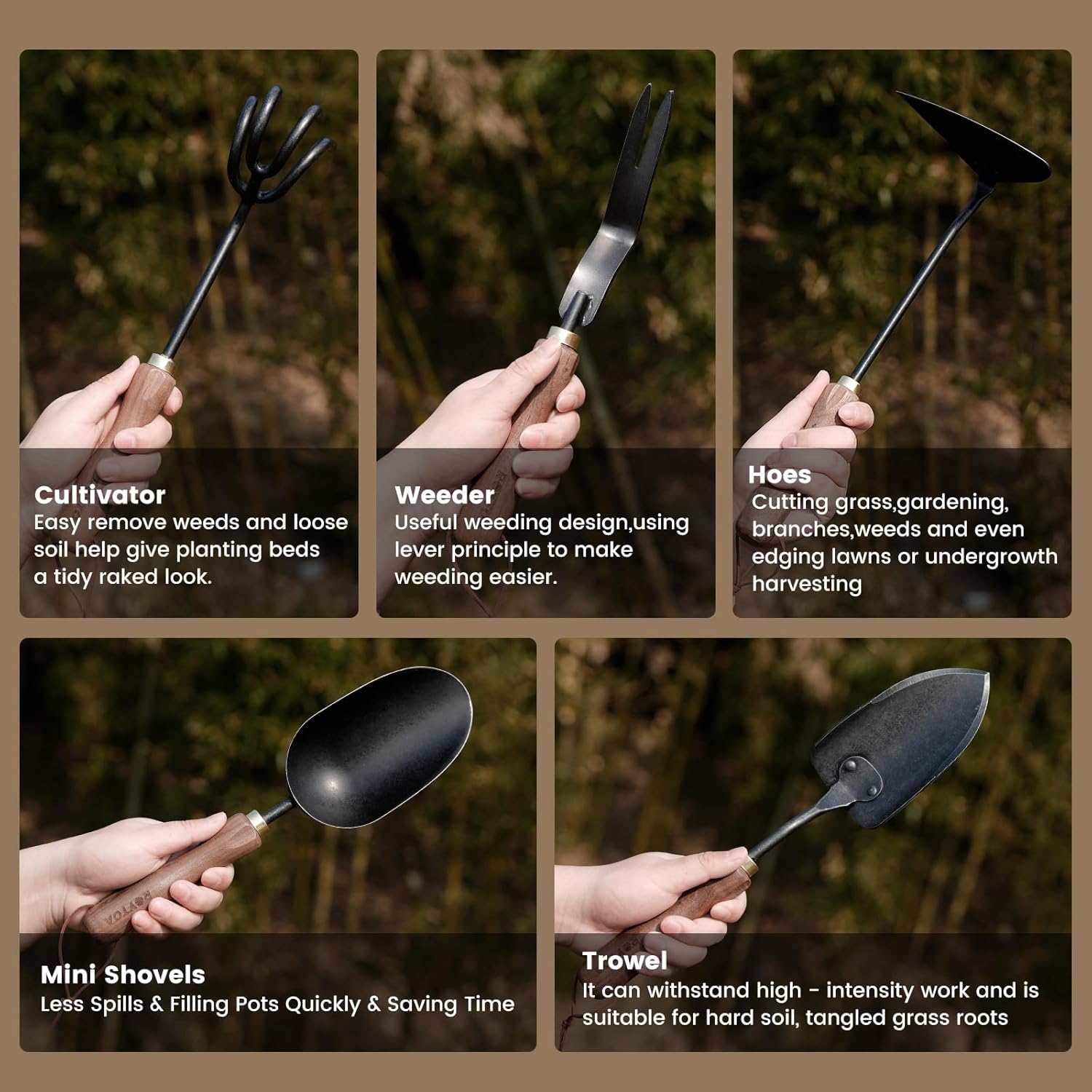 - 【Complete In One Step】Including garden Hand Cultivator, Hoes,Shovel, Trowel And Weeder, this five-piece set covers the whole process from digging, planting, cleanup. Whether it's a home garden or a small greening project, it's easy to handle and make your gardening work twice as effective.