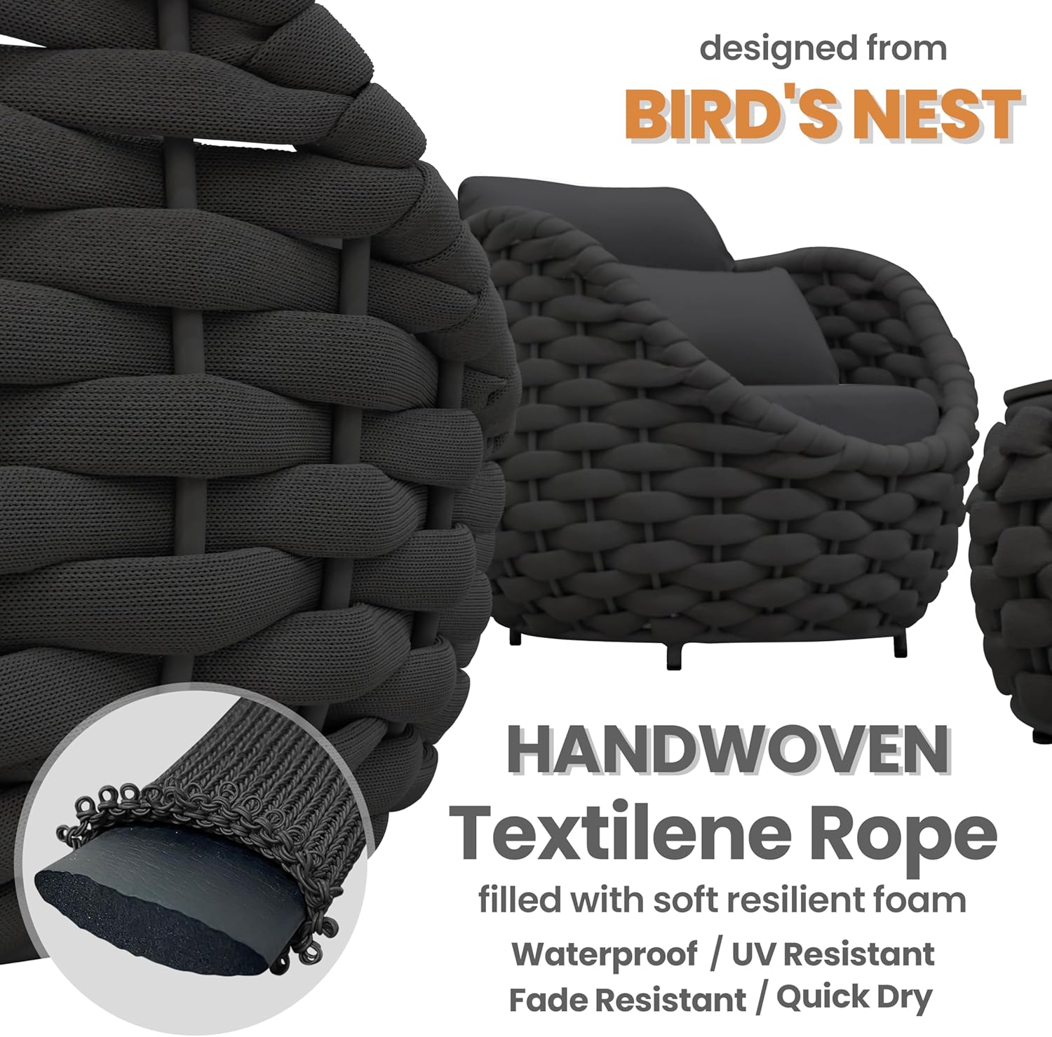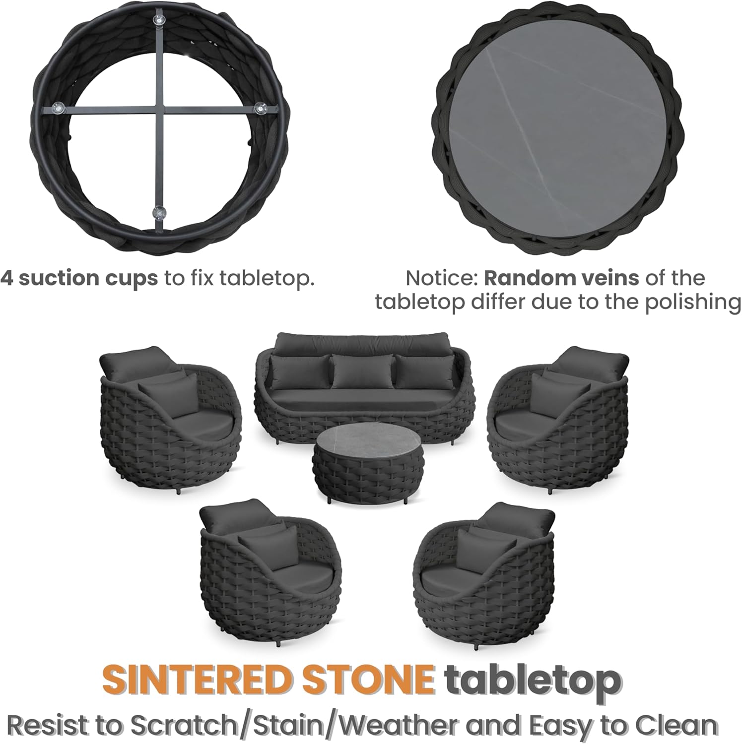 - Furniture set is crafted from reinforced rust-free aluminum alloy frame, wrapped in hand woven textilene rope. The 6 pieces all weather patio upholstered conversation set resists to UV, rain, wind, salt water. Perfect for indoor outdoor even arid or coastal areas