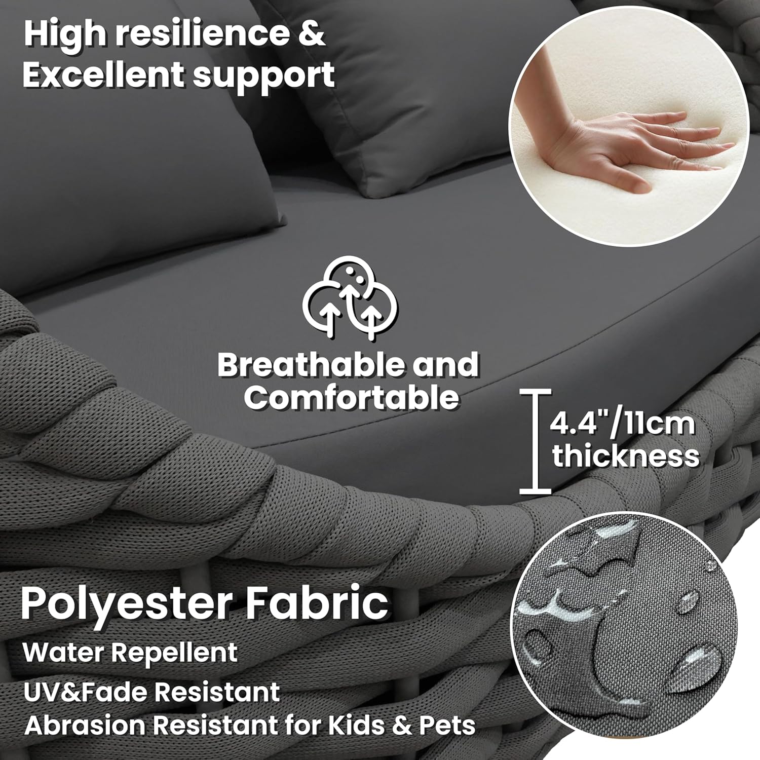 - Filled with 4.3"/11cm thick high-density sponge and cotton, cushions are soft touching and breathable for a refresh comfy patio seating holding its shape in long time using. Water repellent and abrasion resistant polyester fabric also fits families with kids and pets