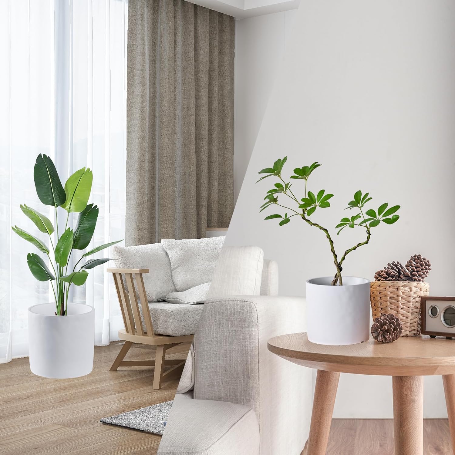 - 【MINIMALIST ROUND DESIGN】This minimalist planter beautifully displays an array of plants. This classic white planter works well with most furniture. The round shape of this planter will bring an incredibly modern touch to your home.