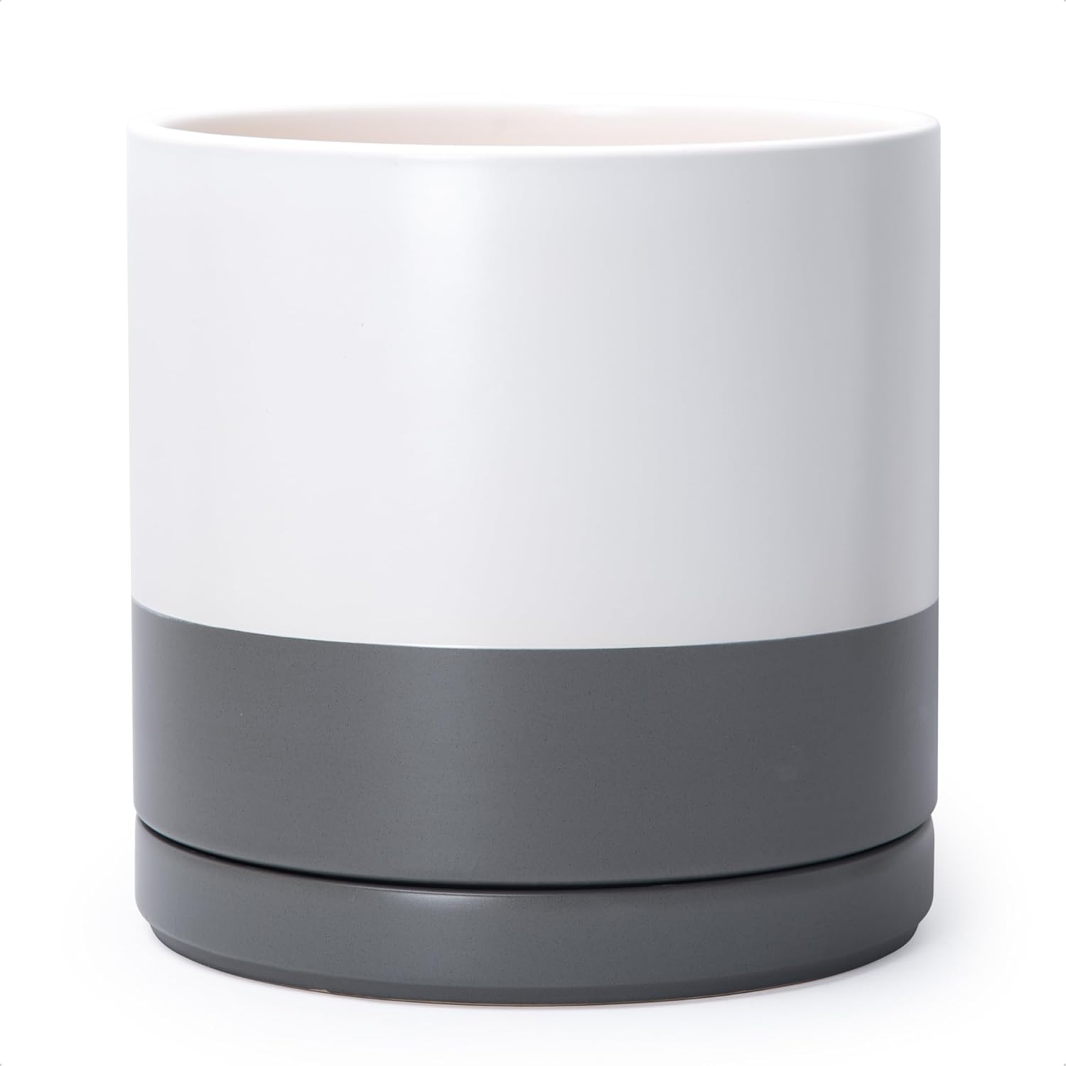 - Simple, elegant, and modern cylindrical straight round planter pot with saucer and drainage hole.