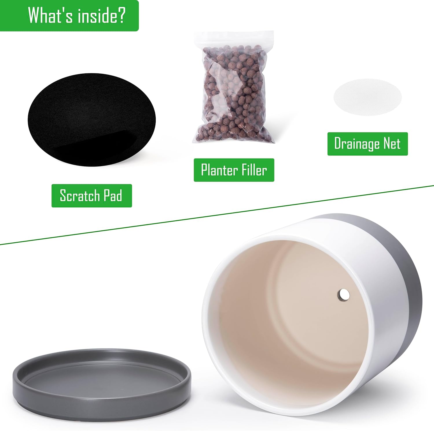 - Planter pot with drainage hole, mesh drainage net and protective scratch pad included.
