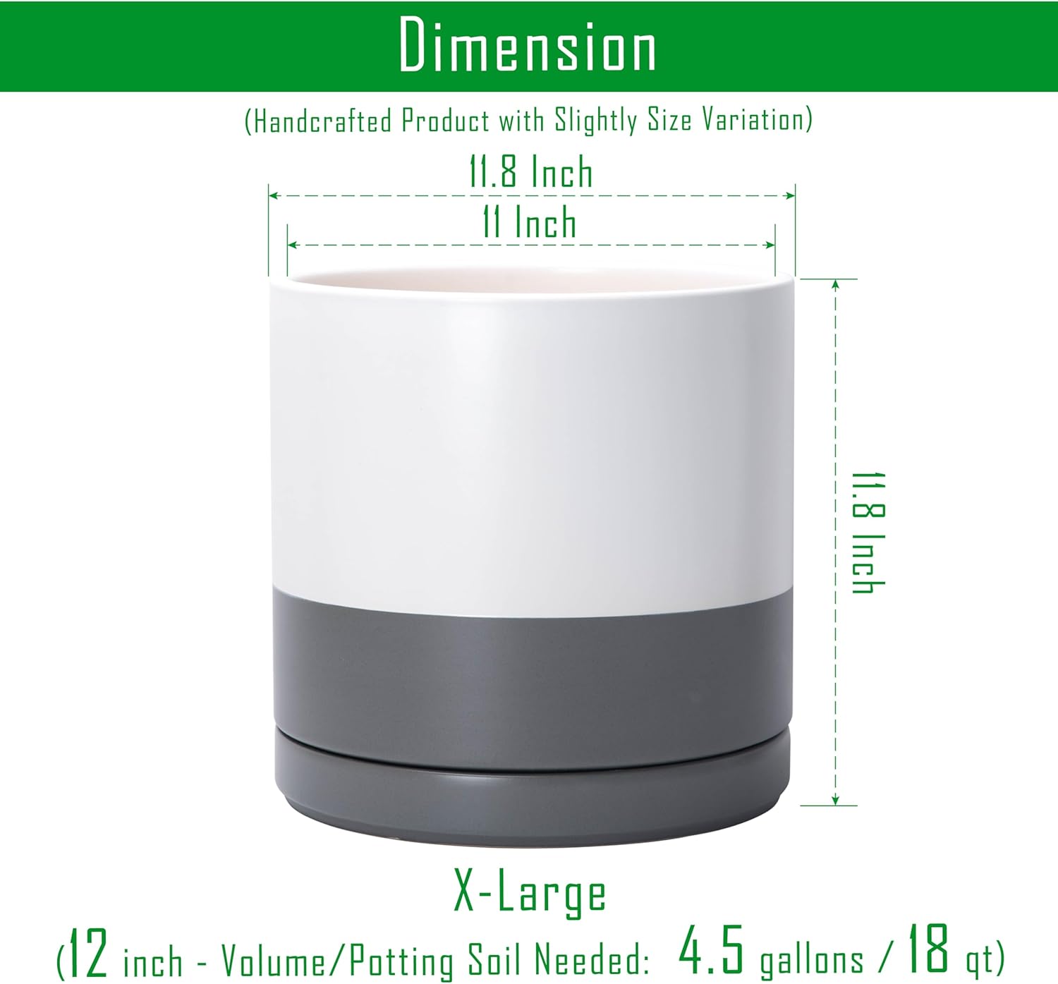 - X-Large 12 Inch Planter Pot: 11.8" Diameter x 11.8" H, white/speckled grey color. Potting Soil Needed: 4.5 gallons / 17 qt.