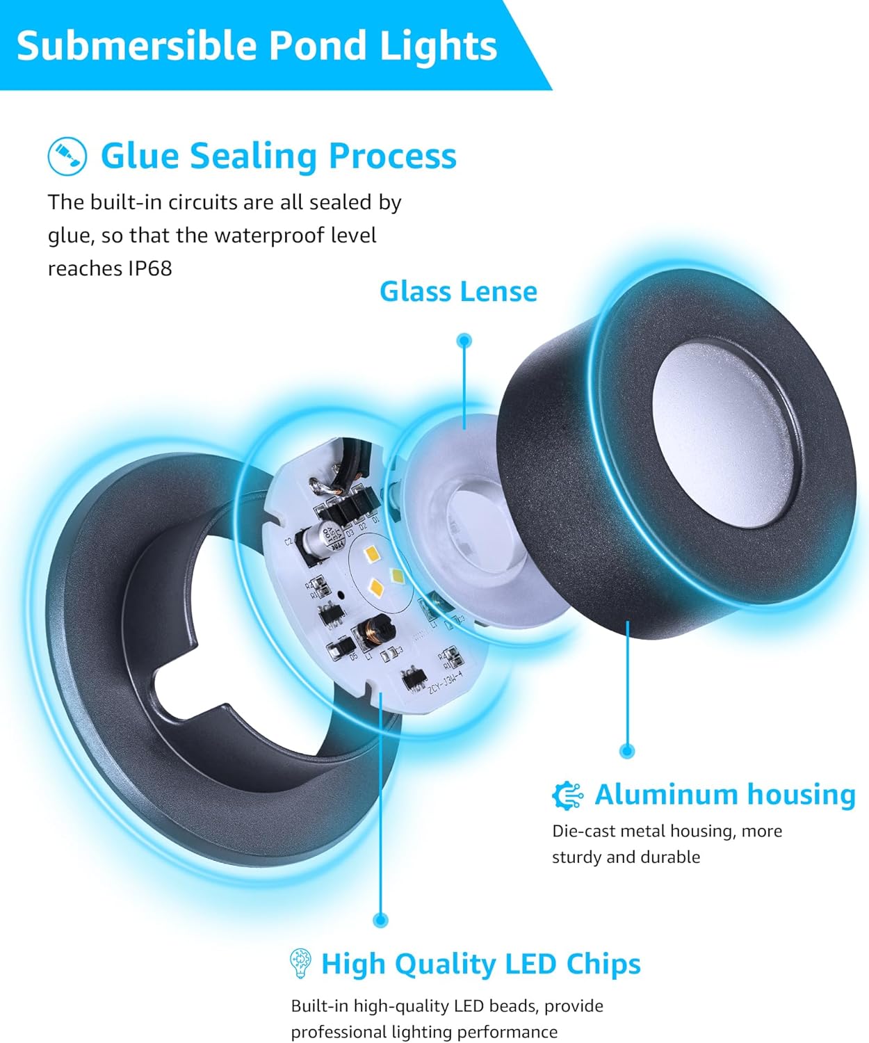 - 【Glue Sealing Process】- The fountain lights adopts the glue sealing process. The built-in circuits are all sealed by glue, so that the waterproof level reaches IP68, and the maximum diving depth can reach 16.4ft. The adhesive layer also has good heat dissipation performance, ensuring that the fountain lights led underwater can be used underwater for a long time.
