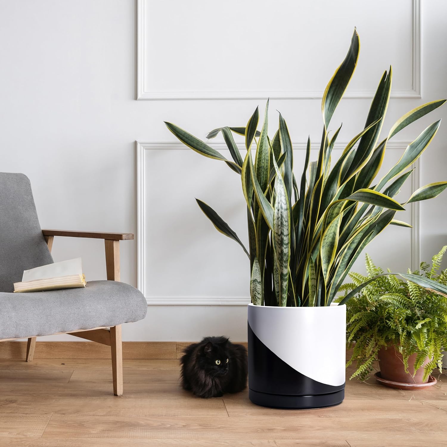 D'vine Dev 12 Inch Ceramic Planter Pot with Drainage Hole and Saucer, Indoor Cylinder Round Planter Pot, Oblique Monochrome Black and White, 94-O-F-K