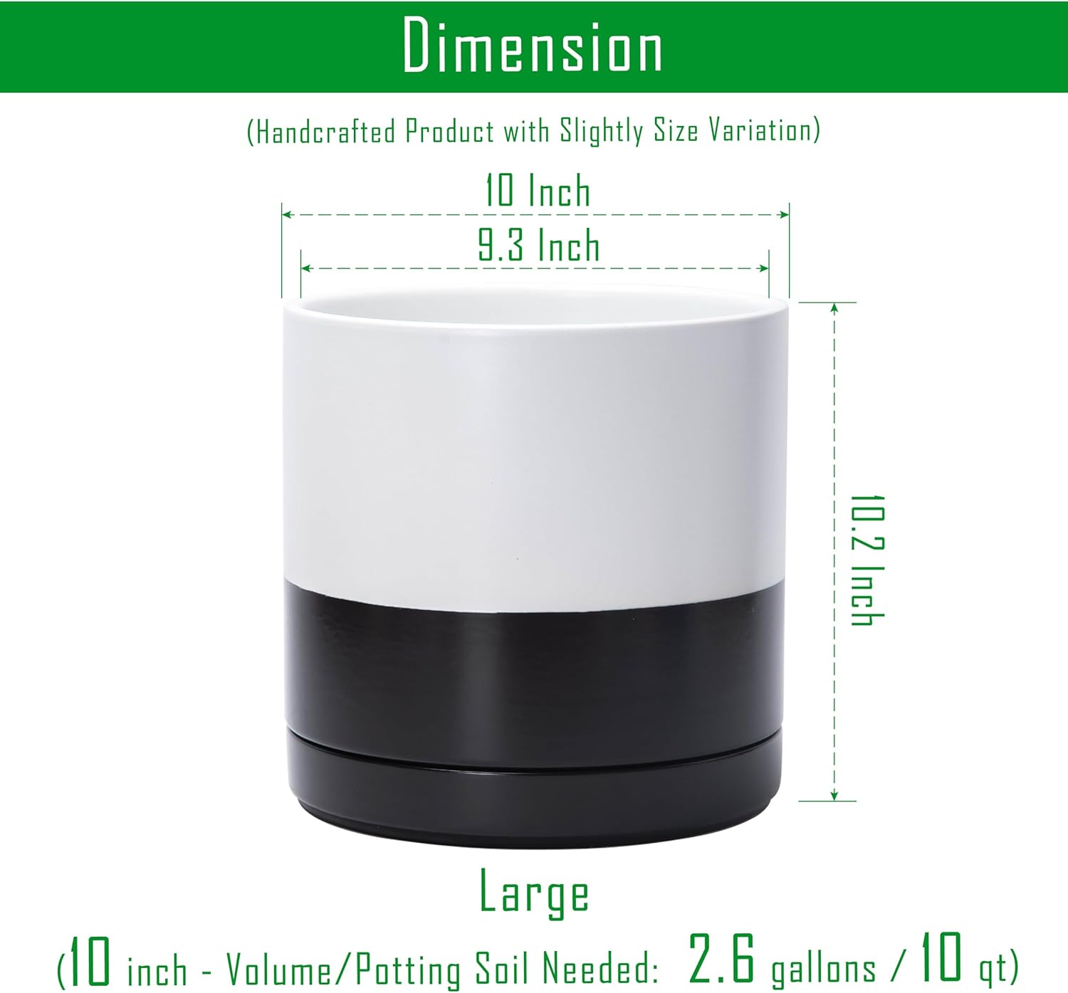 - Multiple Size Options: Available in six sizes (3.5" to 11.8") to fit plants of all types, from small succulents to larger houseplants. Large 10 Inch Planter Pot: 10" Diameter x 10.2" H, Potting Soil Needed: 2.6 gallons / 10 qt.