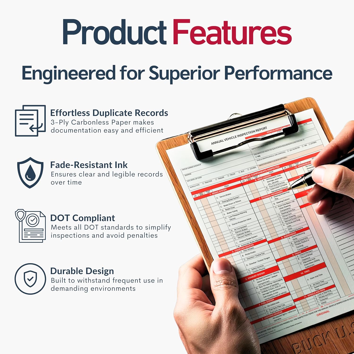 25 Pack Buck 3-Ply Carbonless Annual Vehicle Inspection Report Forms with Red Aluminum FMCSA Adhesive Labels with Punch Boxes, FMCSA & DOT Compliant, Shrinkwrapped Bundle, 8.5" x 11.8" - Made in USA