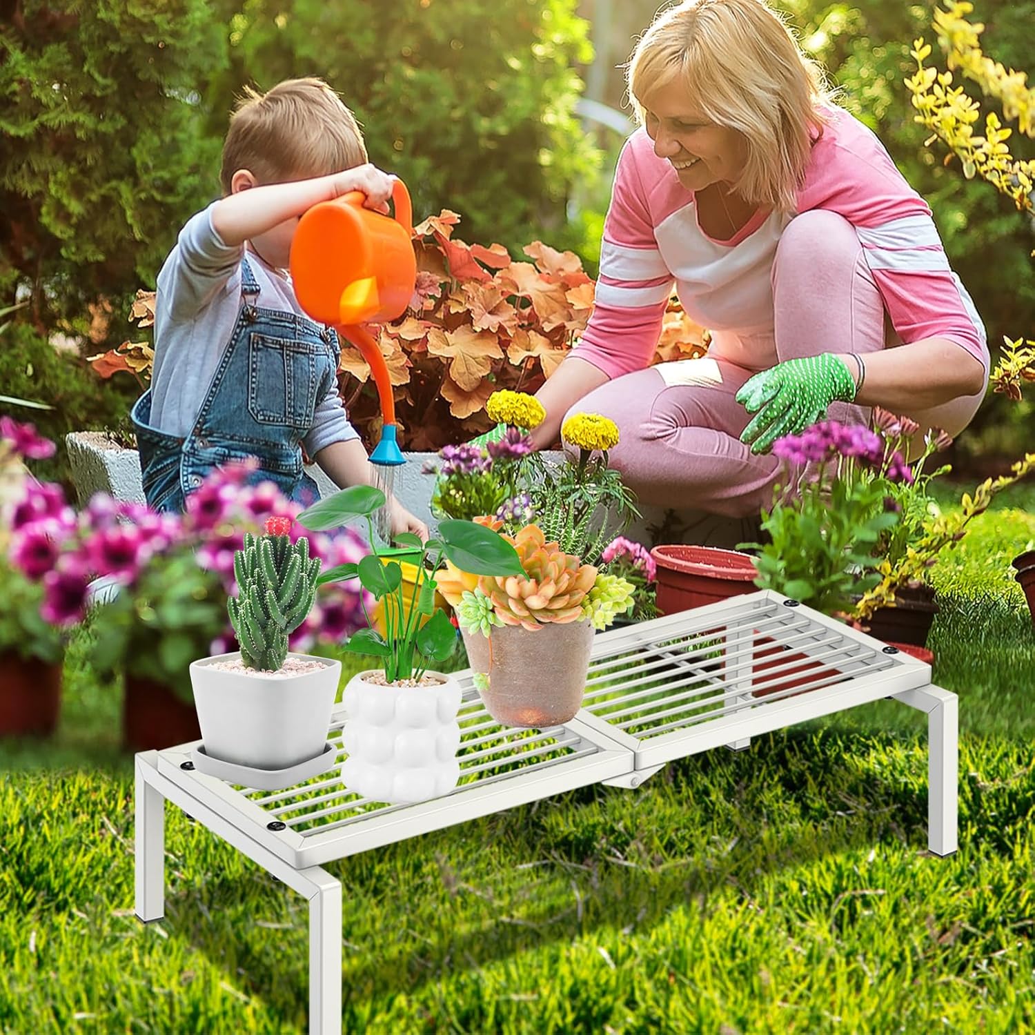 - Product Dimension: The metal plant shelf measures 31.1" L x 11.8" W x 8.1" H, with its sturdy grid and reinforced construction ensuring pots of all sizes stay securely in place.