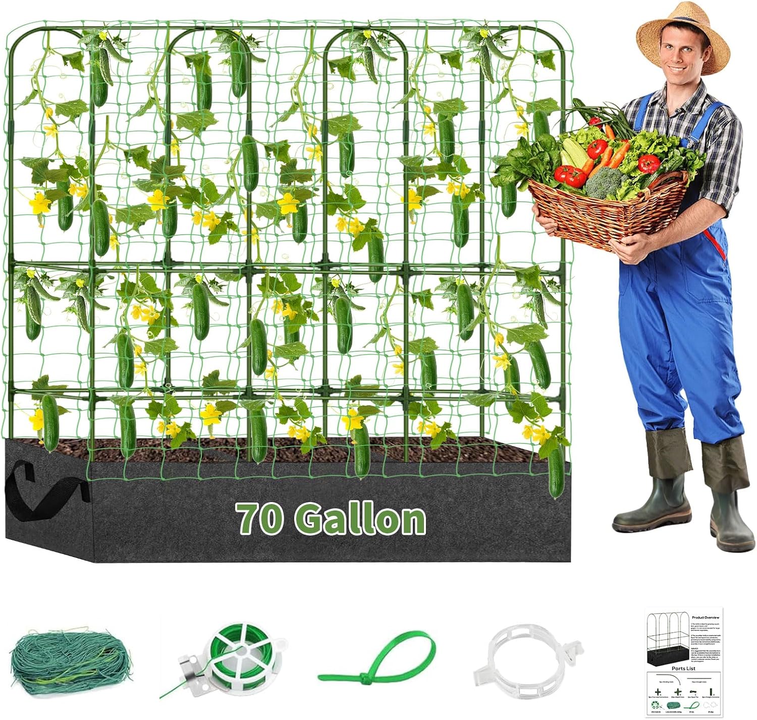 PASARA Cucumber Trellis with Grow Bag - Garden Trellis for Climbing Vegetables, 65 X 50 Inch Large Metal Trellis for Climbing Plants Outdoor, Including Twist Ties, Clips, Ties, Nylon Garden Lattice