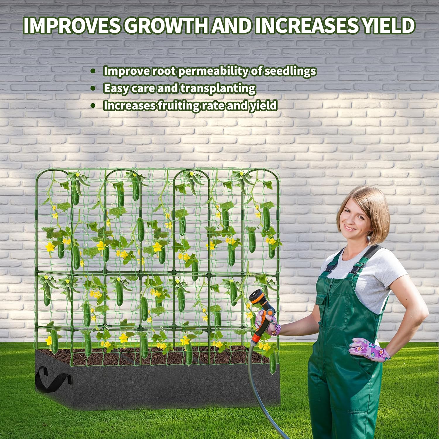 - CUCUMBER TRELLIS WITH GROW BAG: The thickened felt planting bag improves root aeration, boosting survival and fruiting rates. The handles at both ends make transplanting easy, and the 18x52x12-inch large space meets the soil needs throughout the entire growth cycle.