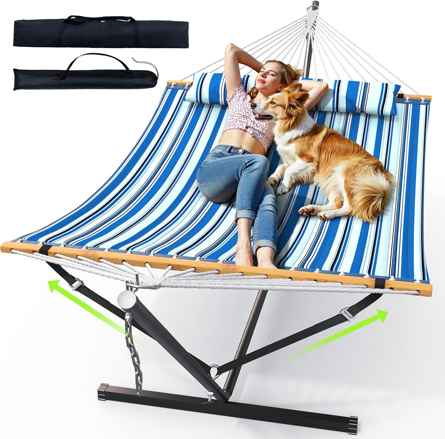 Double Hammock with Stand for Outdoor, Heavy Duty Portable Hammock with Adjustable Steel Stand for Patio, Garden, Beach, Backyard - Includes Carrying Bag,Blue