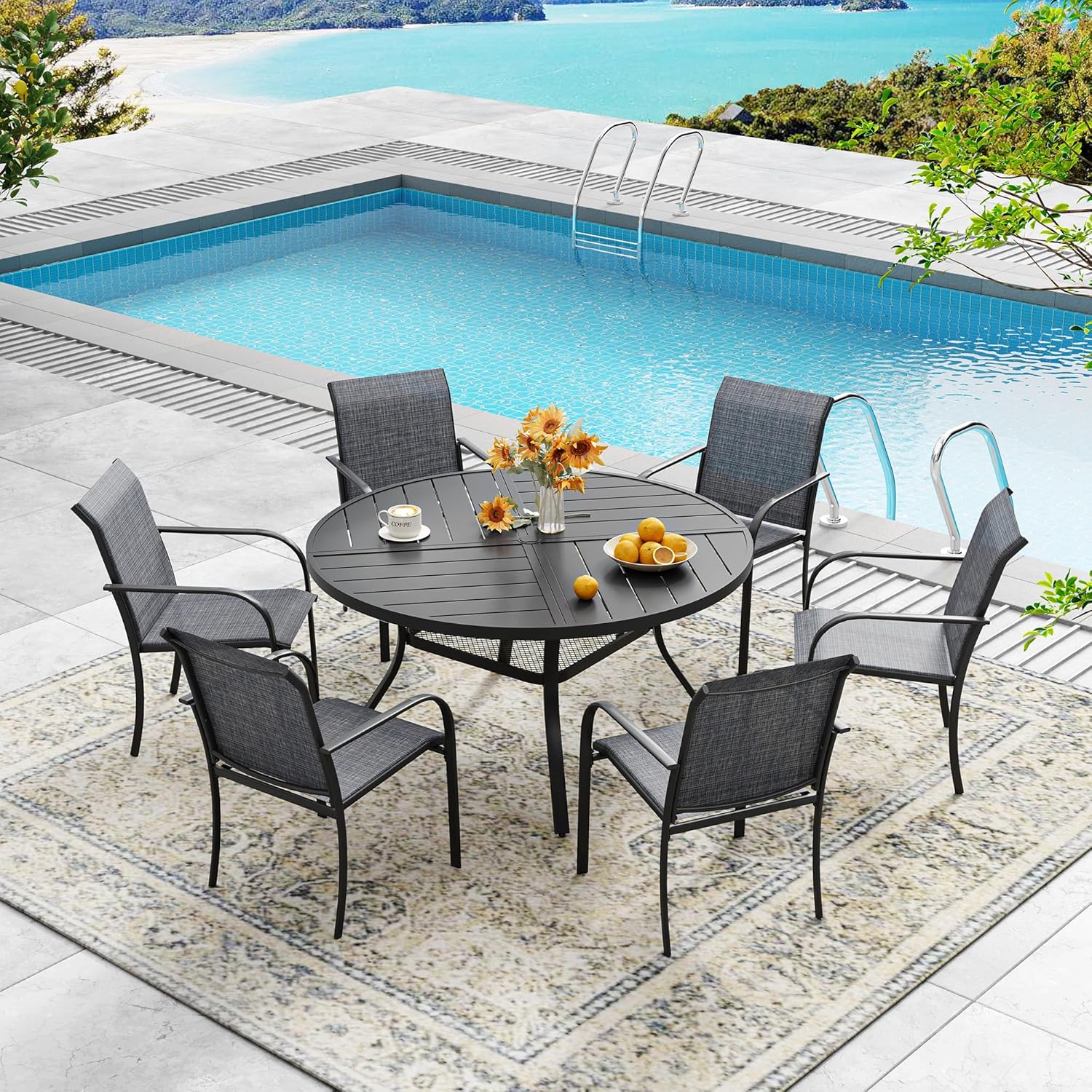 DIFY 47.2" Round Outdoor Patio Dining Table for 6, All-Weather Metal Steel Slatted Patio Table with 1.57" Adjustable Umbrella Hole, for Lawn Garden Porch Backyard, Black