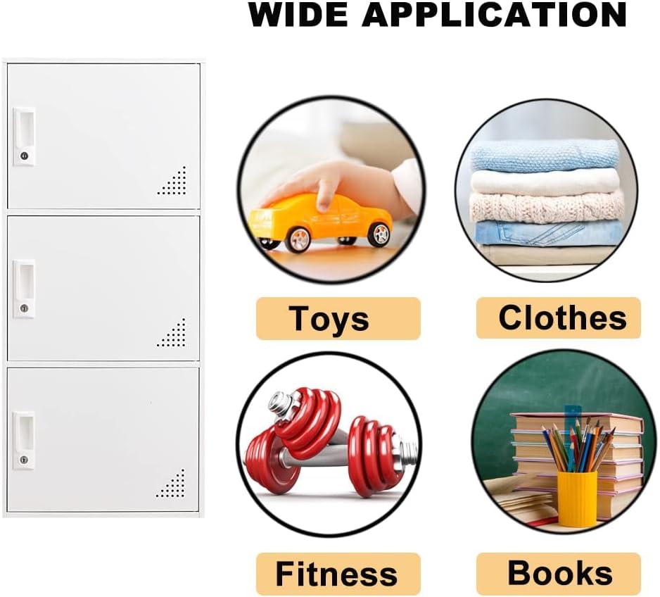 - 3-Door Storage Cabinet Applicable in Multiple Scenarios: Our 3-door metal storage cabinet is a highly adaptable storage product. With its simple and elegant appearance and practical internal structure, teaching aids and students' items in schools, files and materials in offices, and clothes and sundries at home. It is a great helper for storage in all kinds of scenes.