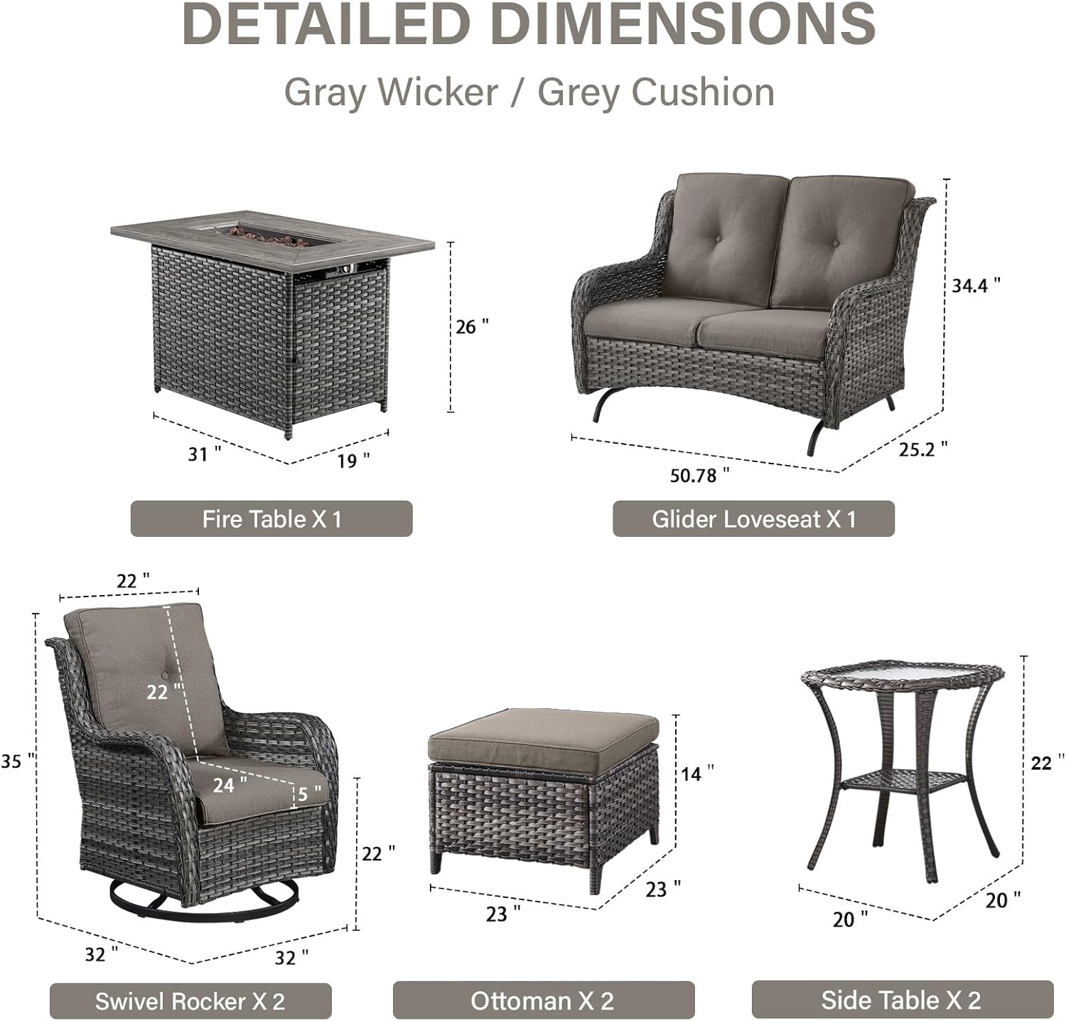 - 8-Piece Outdoor Patio Conversation Set: This thoughtfully designed outdoor furniture set includes a wicker loveseat glider chair, two swivel rocker chairs, two ottomans, two side tables, and a 41-inch 50,000 BTU propane fire pit table. Perfect for creating a comfortable and stylish patio conversation area in your backyard, porch, or deck.