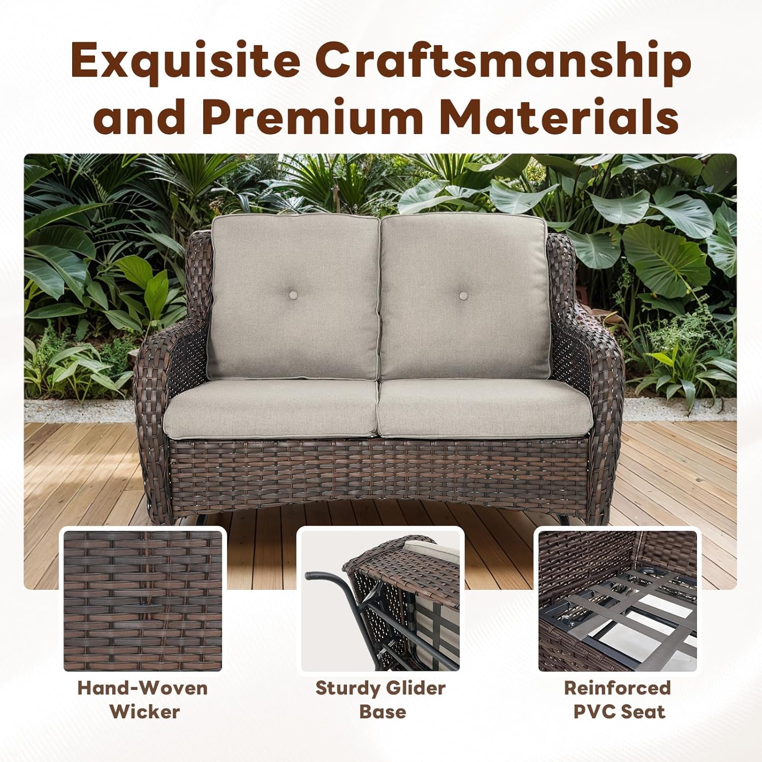 Spacious Outdoor Glider Bench - 500 LBS Weight Capacity Small Loveseat, 2 Seater Patio Gliders Furniture All Weather Wicker Couch with Removable Cushion for Deck Sunroom Balcony Backyard