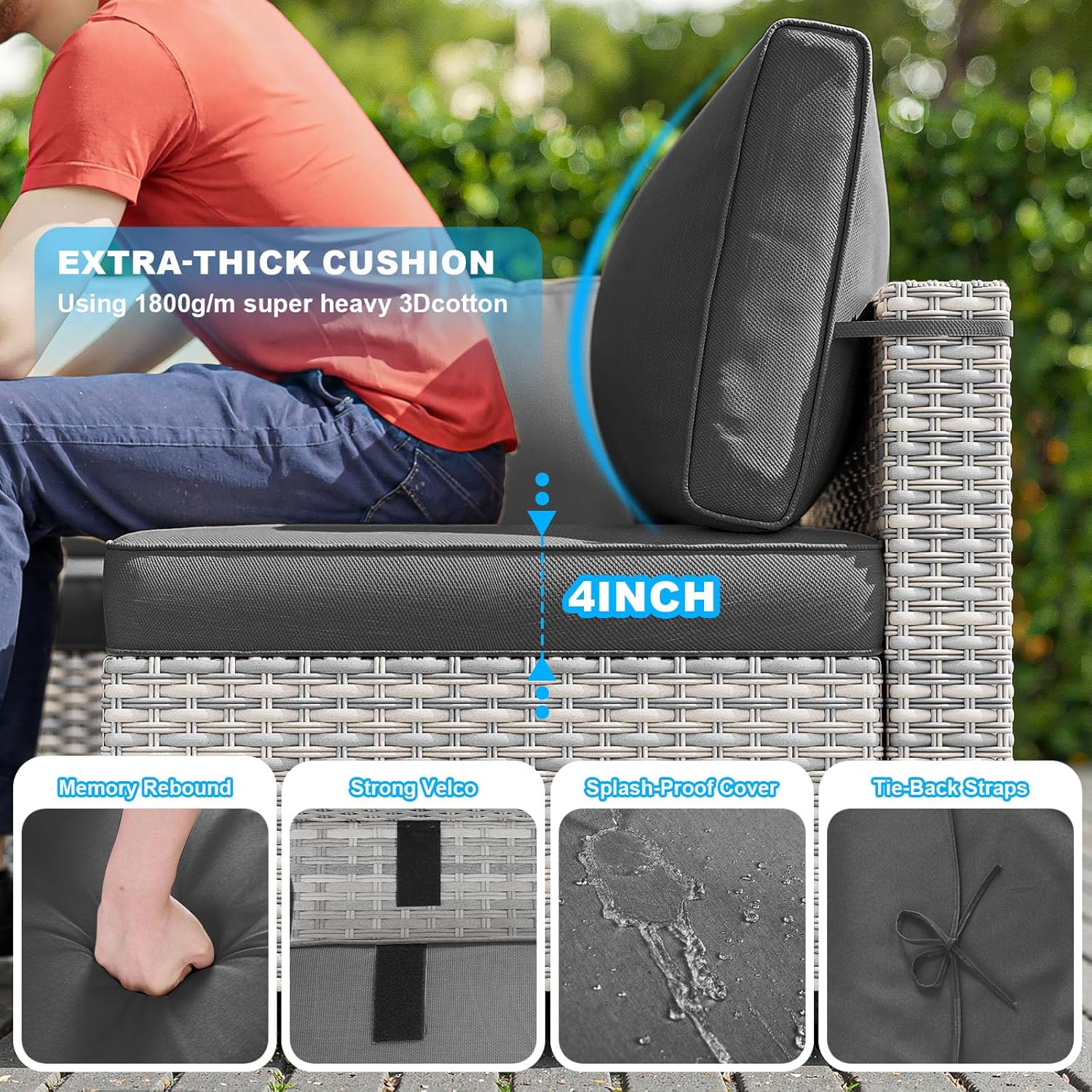 - Thickened Cushions:Experience unmatched relaxation with upgraded 4-inch thick seat cushions and ergonomic back cushions. Crafted with high-density upright fiber cores, these cushions provide optimal support and resilience, ensuring they retain their shape even with prolonged use. Designed for both comfort and durability, the water-resistant cushion covers are easy to clean and maintain, making this patio furniture set perfect for outdoor living.