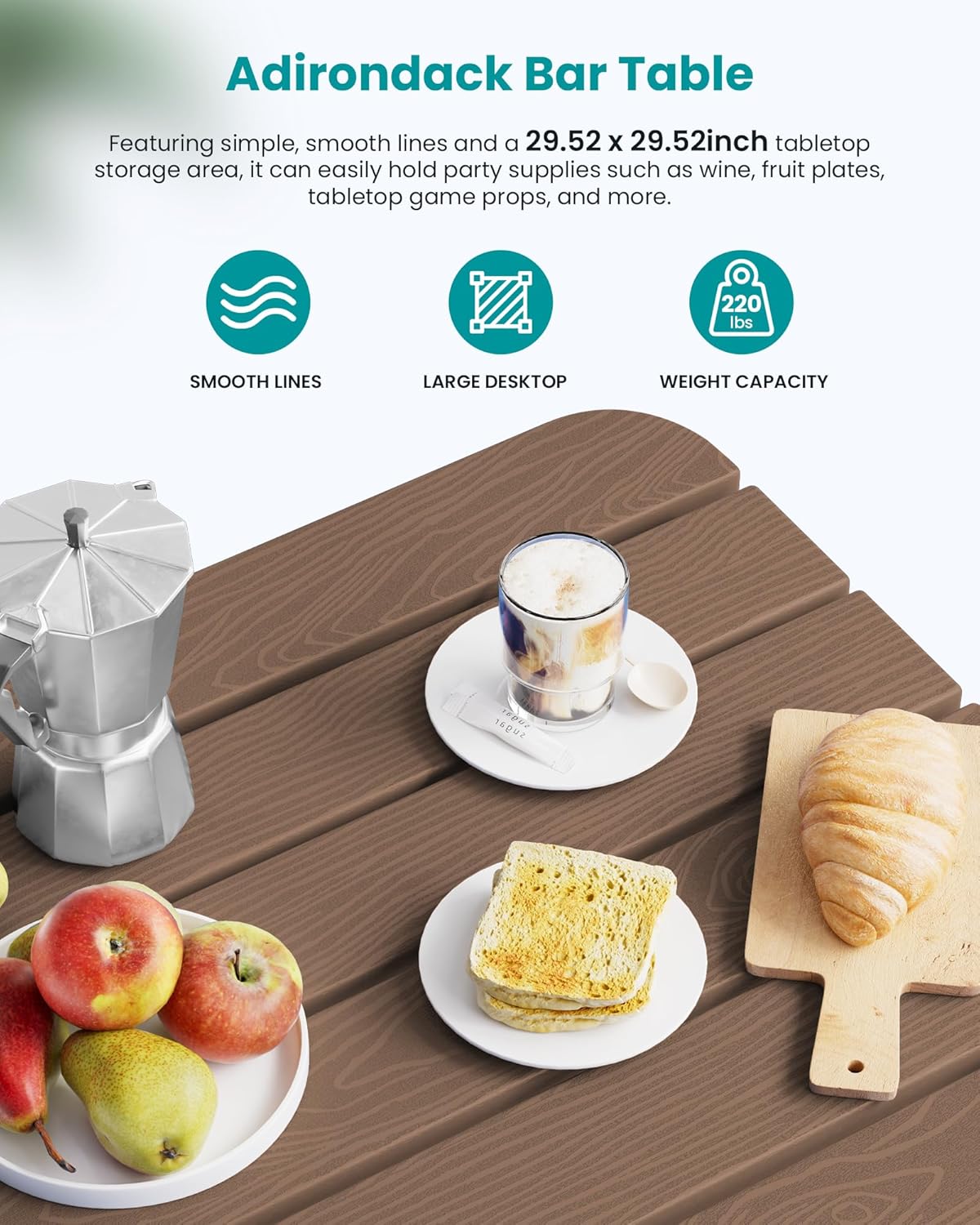 - With Adirondack Bar Table - Featuring simple, smooth lines and a 29.52 x 29.52-inch tabletop storage area, it can easily hold party supplies such as wine, fruit plates, tabletop game props, and more. Whether placed indoors or outdoors, this bar table will add convenience.