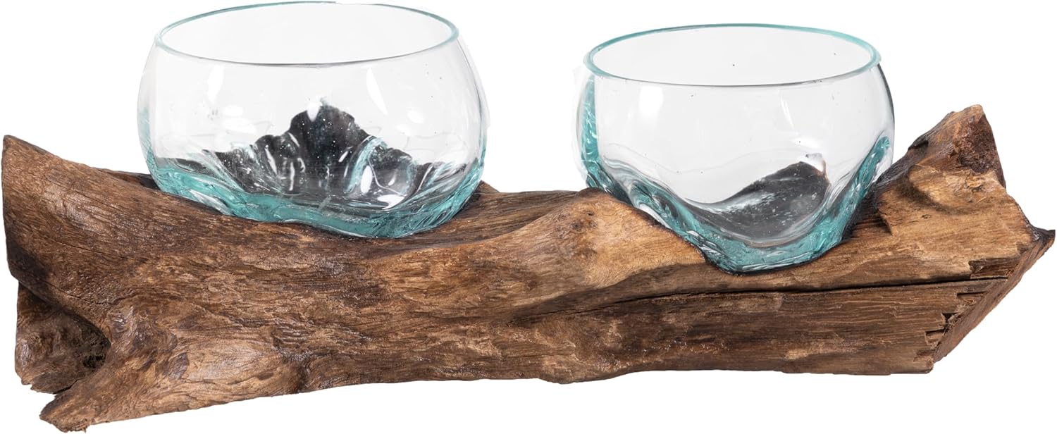 - ONE OF A KIND: Because each beautiful planter display is hand-made, each is unique. To assemble: simply set the glass topper on the driftwood base in the natural grooves of the base. The item is constructed by pressing the glass into the base, so each has a unique formation. Once correctly aligned, it will be a perfect fit! Simply place the glass to the base and you are all set to start displaying! Approximate overall size: 4.5"H x 13"L x 7"W, with 2 terrariums measuring 4" diameter.