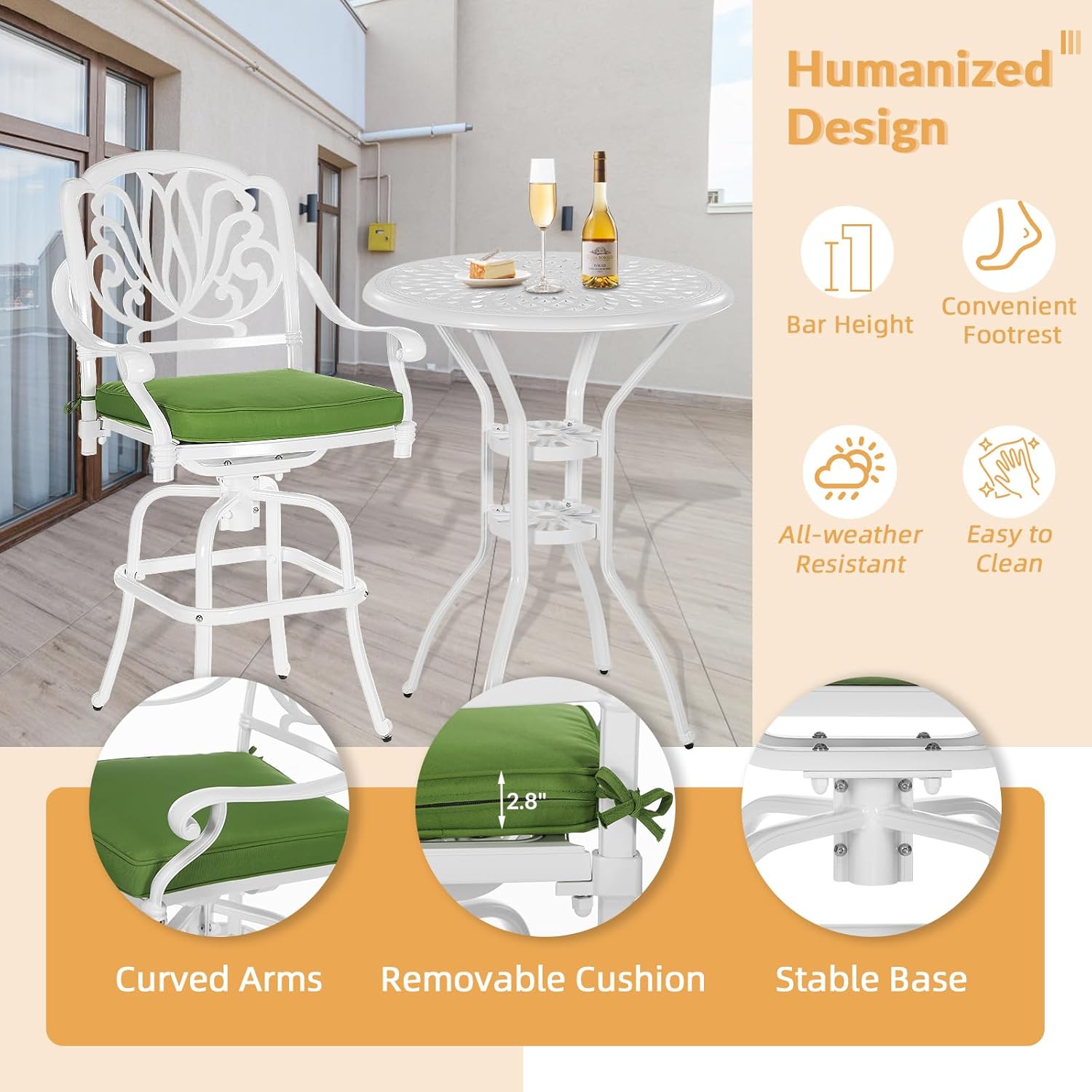 - 【Premium Materials】The outdoor swivel bar stools set is made from cast aluminum for long-term durability. Resistant to rust, weather, fade, crack. The patio furniture set features an pure white finish for a elegant look that is designed to withstand the elements year-round. If you use this set by the pool, it’s all-weather quality helps prevent water damage caused by wet swimsuits and splashing. It is also easy to clean, you just need to use a cloth to easily wipe away the dirty things.