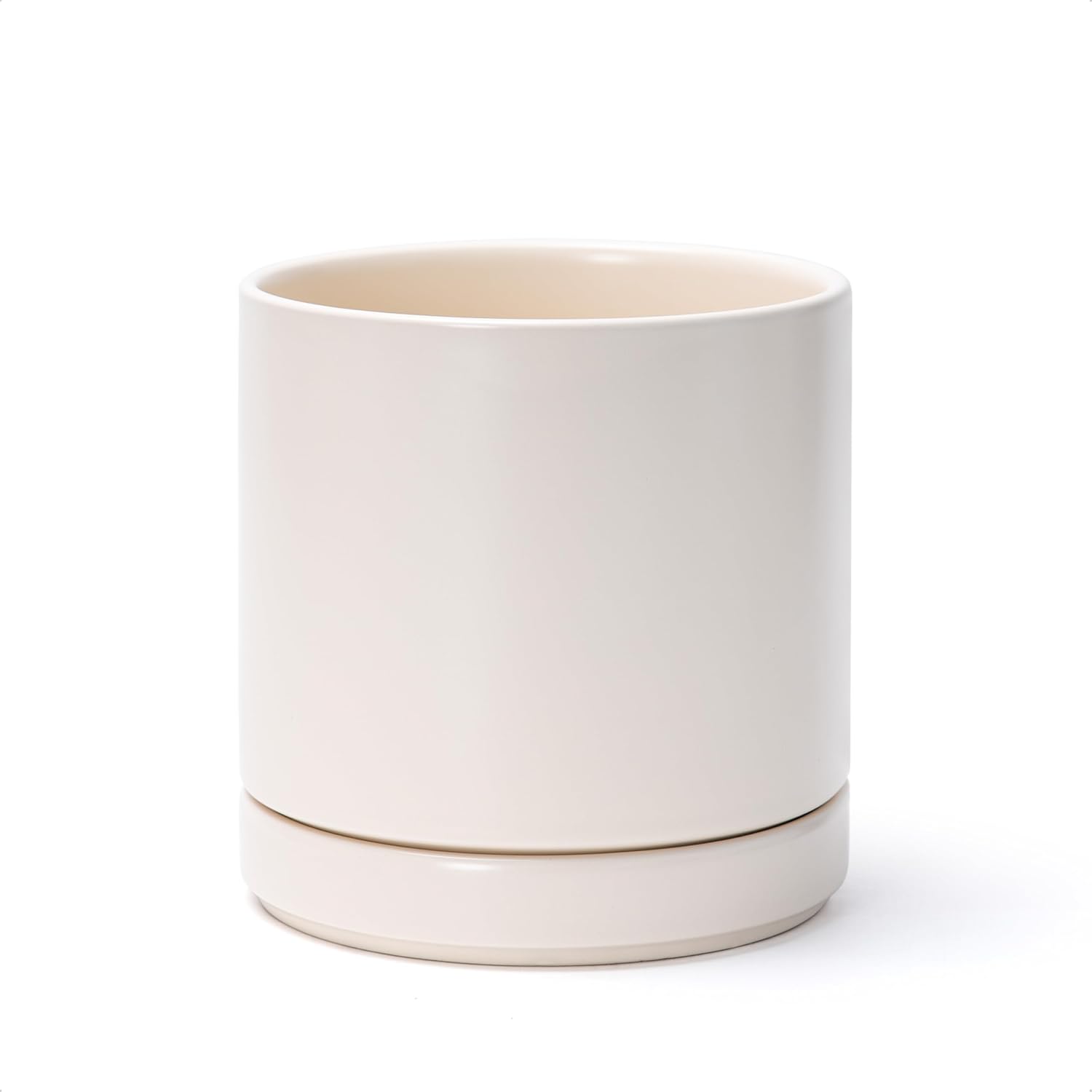 - Simple, elegant, and modern cylindrical straight round planter pot with saucer and drainage hole.