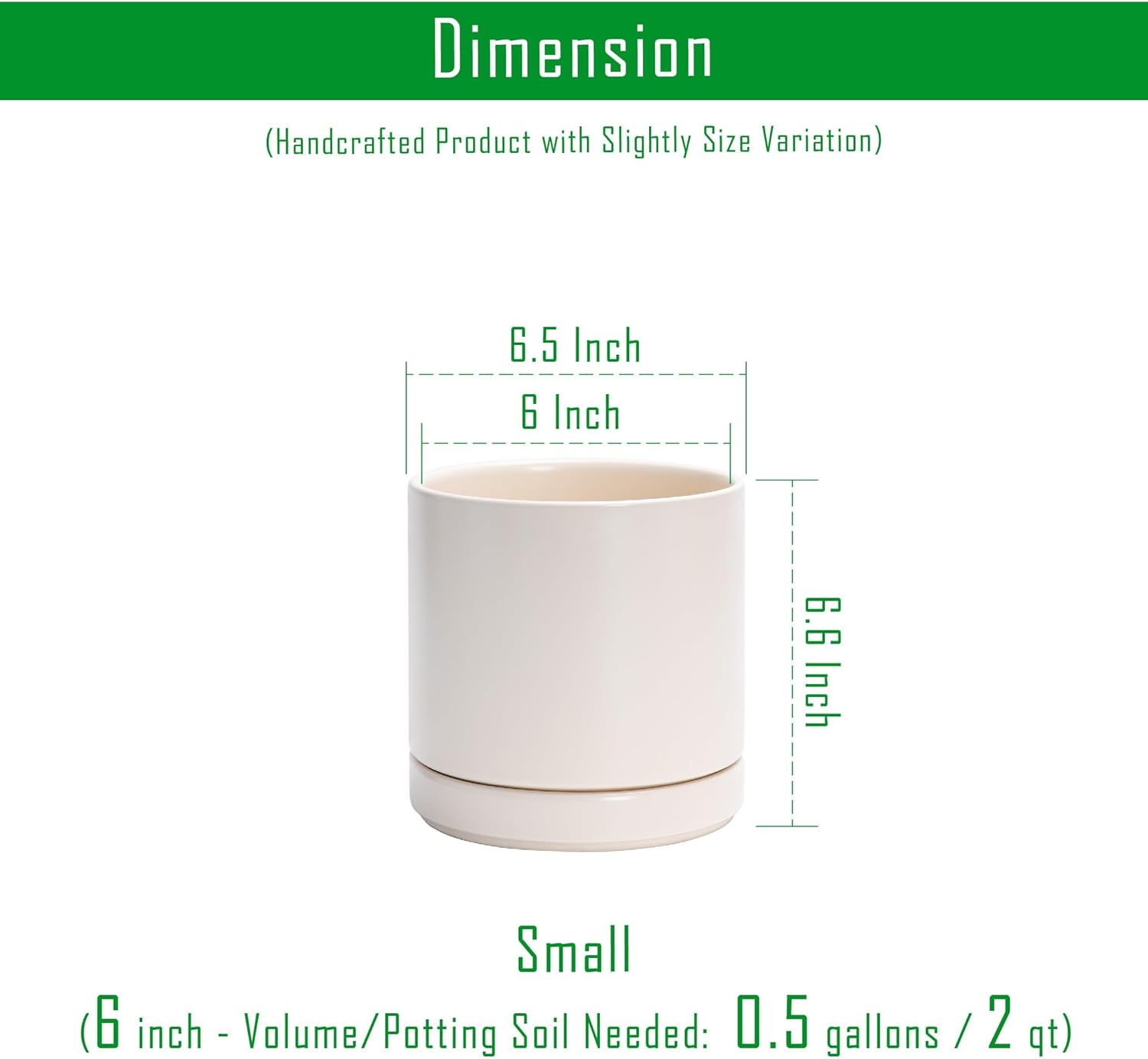 - Small 6 Inch Planter Pot: 6.5" Diameter x 6.6" H, oatmeal color. Potting Soil Needed: 0.5 gallons / 2 qt.