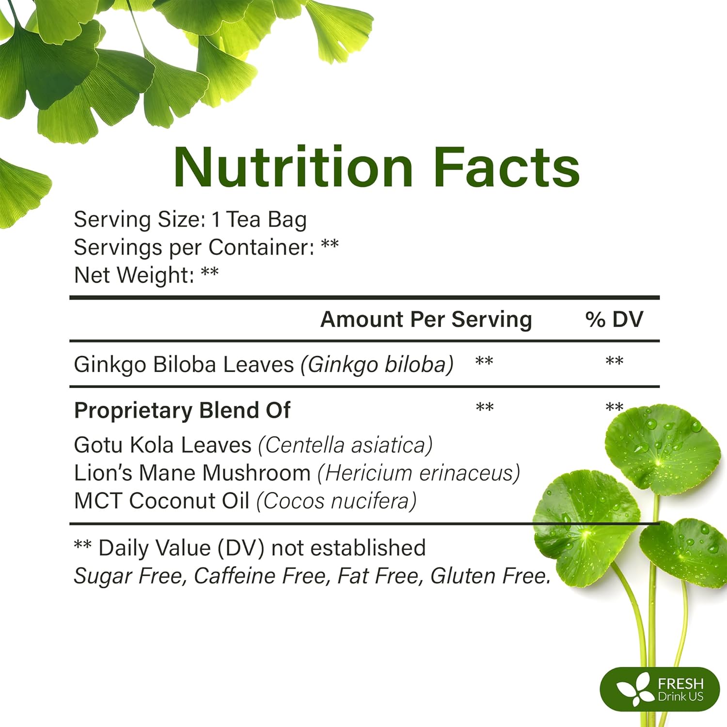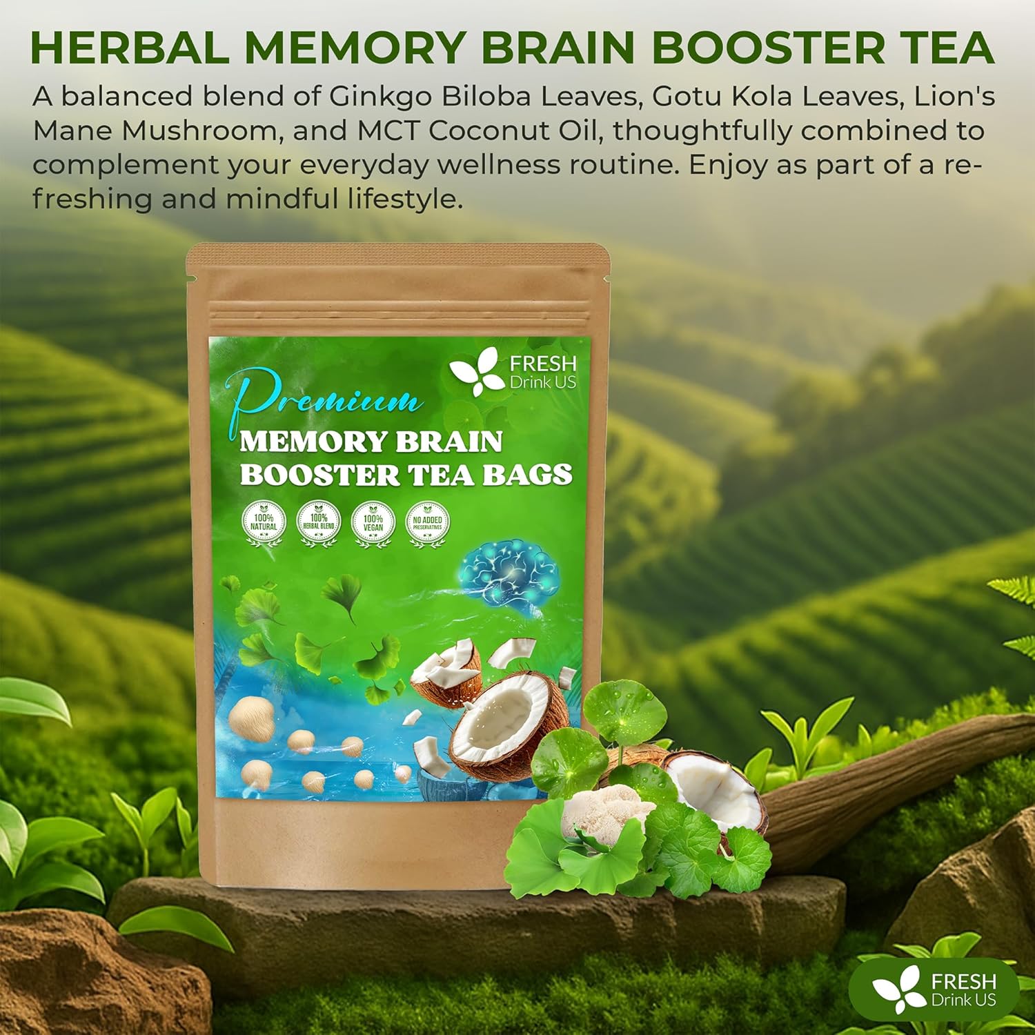 FreshDrinkUS, Memory Brain Booster Herbal Tea – 40 Tea Bags – Ginkgo Biloba, Gotu Kola, Lion's Mane & MCT Coconut Oil – Smooth, Earthy Flavor – Caffeine-Free – Daily Herbal Blend for Anytime Use