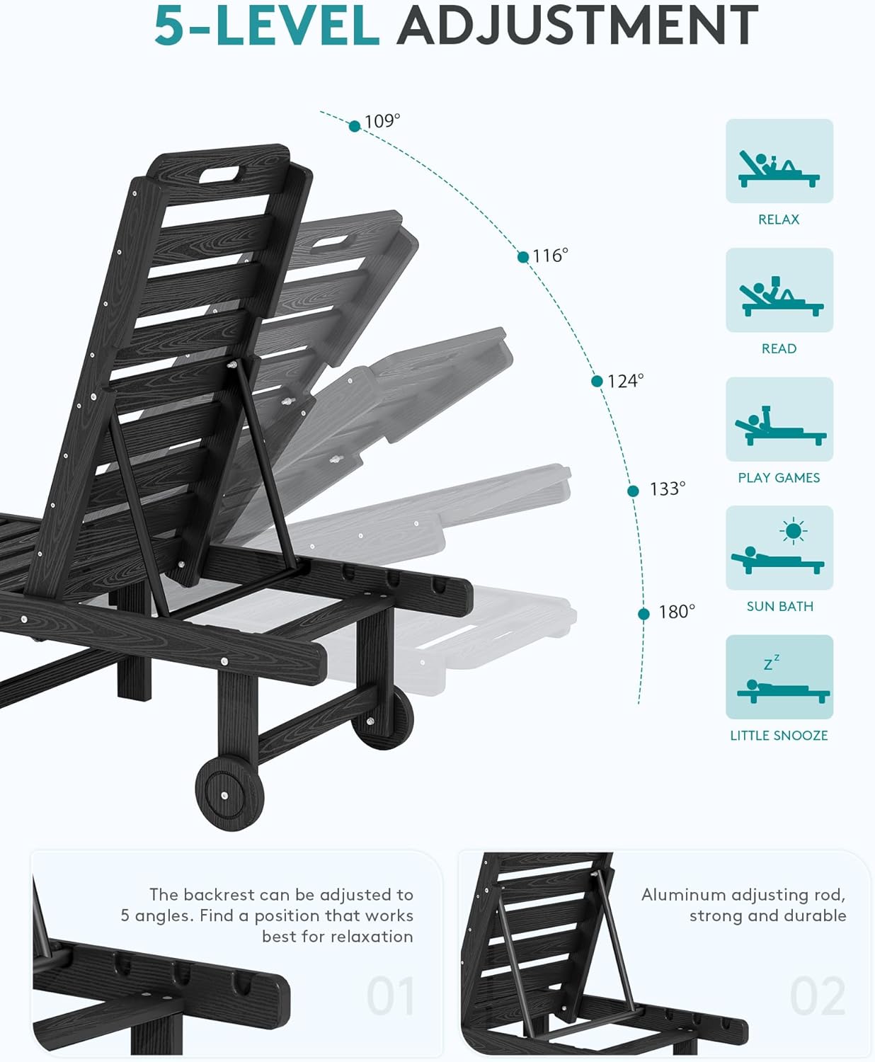 - Rolling Wheels & Handles: This patio chaise lounge comes with convenient rolling wheels and handles, pull on the handle to move it easily to follow the sun or find shade. Enjoy the sun and warm weather on this adjustable chaise lounge, our hdpe lounge chair is perfect for poolside, patio, garden, beach, or deck