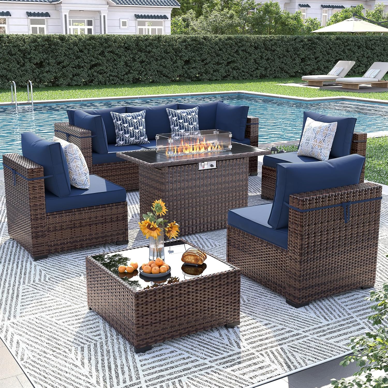 UDPATIO Patio Furniture Set with Fire Pit Table, 8 Piece Outdoor Sectional Modular Sofa, Wicker Outdoor Furniture Conversation Sets with Waterproof Cover for Backyard Deck (Brown/Navy Blue)