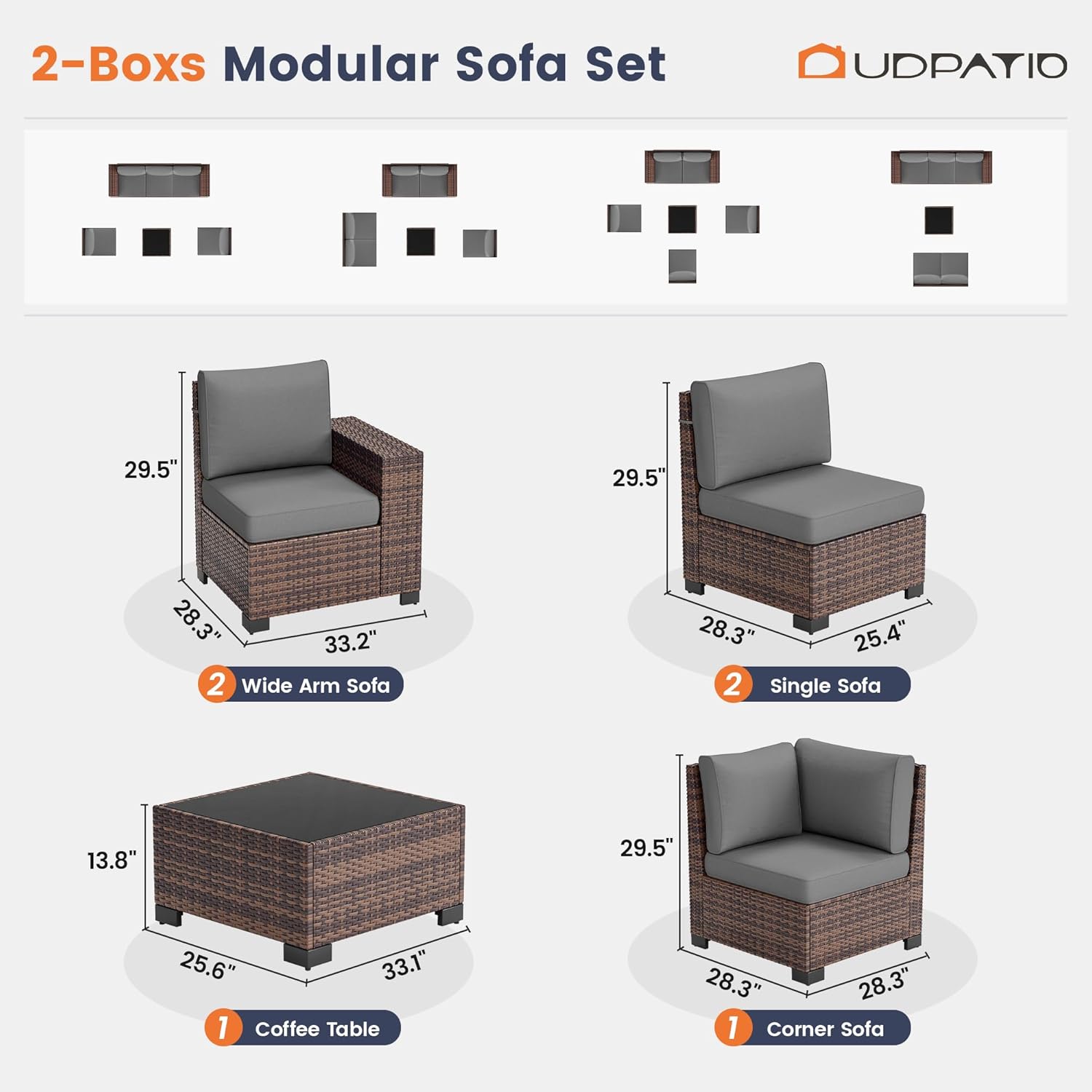 - Easy to Assembly: Delivered in 2 boxes, this outdoor furniture set includes 3 single sofa, 2 corner sofas, 1 coffee table, and 1 protective cover. It comes with a detailed installation manual, making assembly straightforward. The setup takes about 60 minutes for two people.