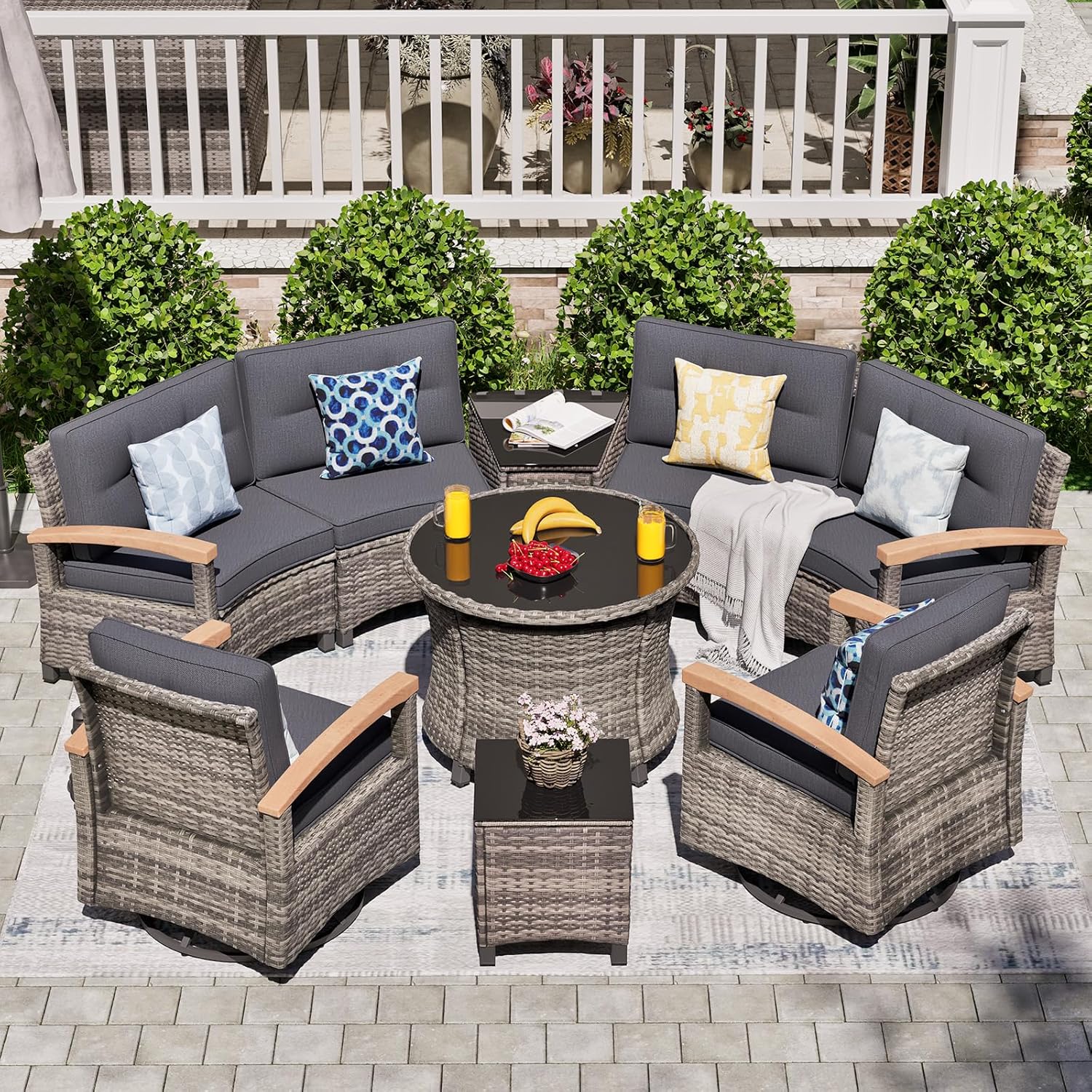 - Unique Half-Moon Design: This half-moon patio furniture set features a stylish semi-circular lounge with four curved sofas and two swivel chairs, perfect for outdoor gatherings on your balcony, patio, or poolside