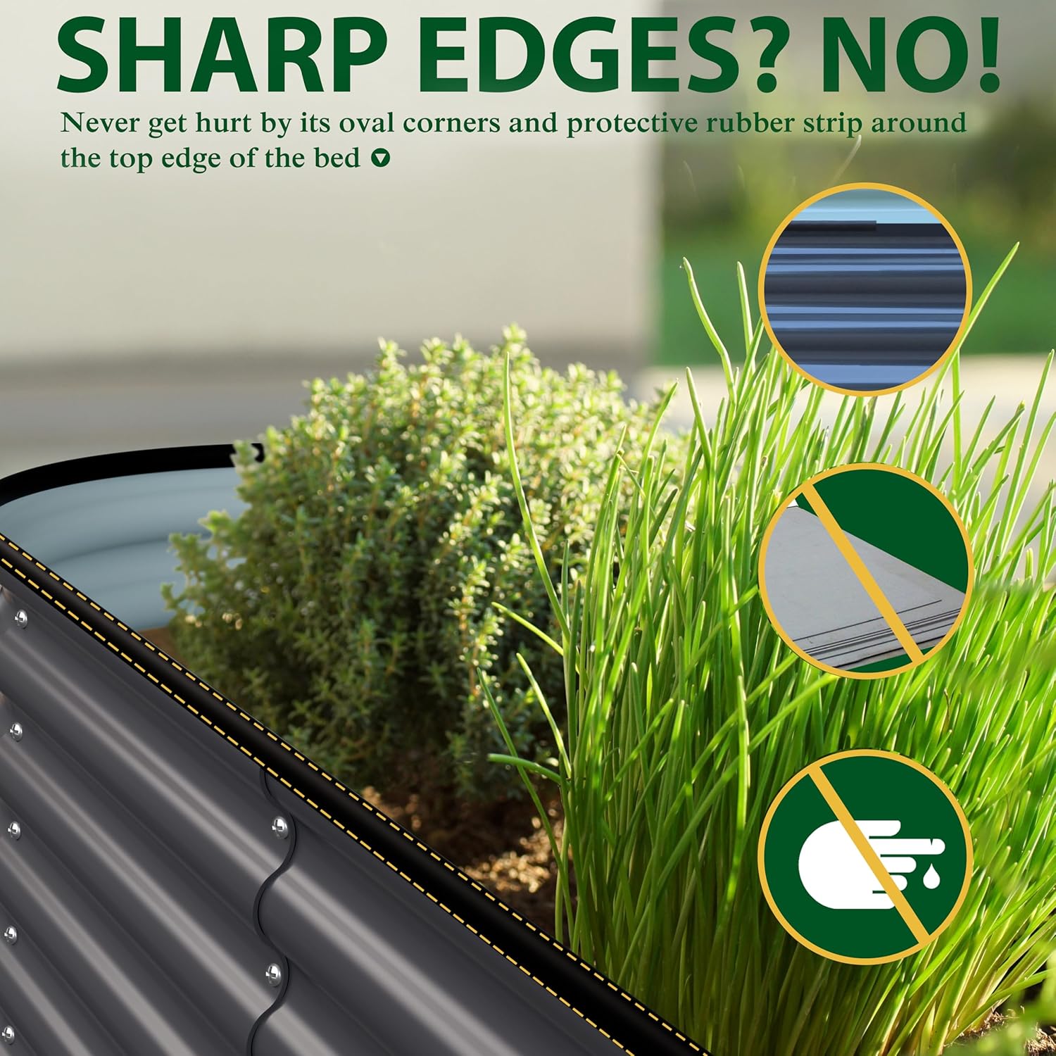 - FOR YOUR SAFETY - We have equipped this metal galvanized raised garden bed with a protective rubber strip around the edge of the raised planter box. Also compared to square garden beds, the rounded design of our raised garden beds outdoor will make it easier for you to walk around while working without being hurt by sharp right angles.