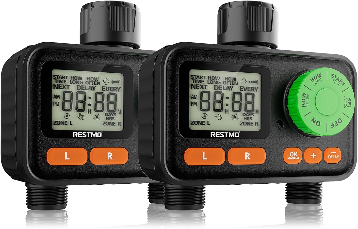 [2 Pack] RESTMO 2 Zone Sprinkler Timer, Programmable Water Timer for Garden Hose, Automatic Digital Control | Manual ON/Off | Rain Delay for Outdoor Faucet, Drip Irrigation and Lawn Watering System