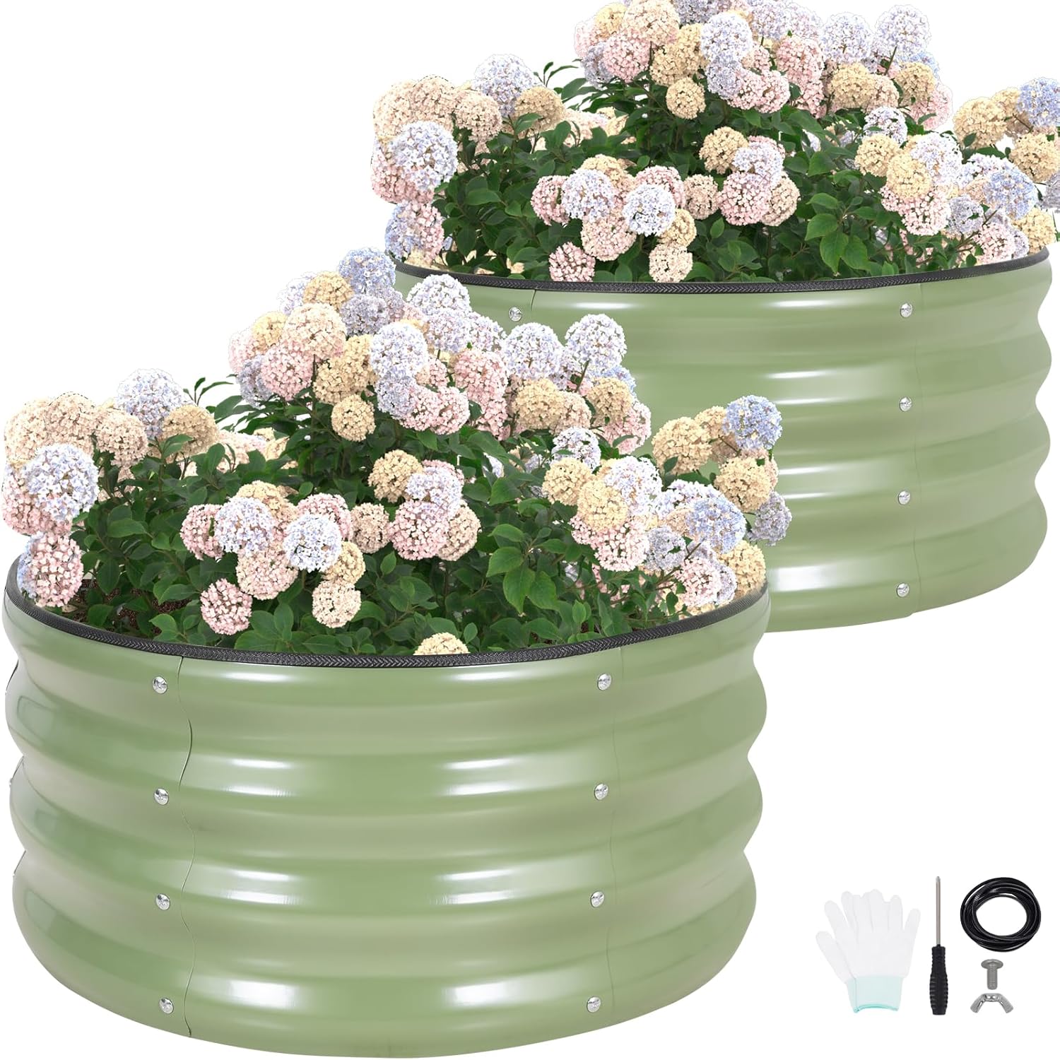 G GOOD GAIN Round Raised Garden Bed - 2Pcs 2x2x1ft Galvanized Steel Planter Boxes Outdoor with Rubber Edge Trim | Metal Raised Beds for Gardening Vegetables Flowers Fruits Herbs (Olive Green)