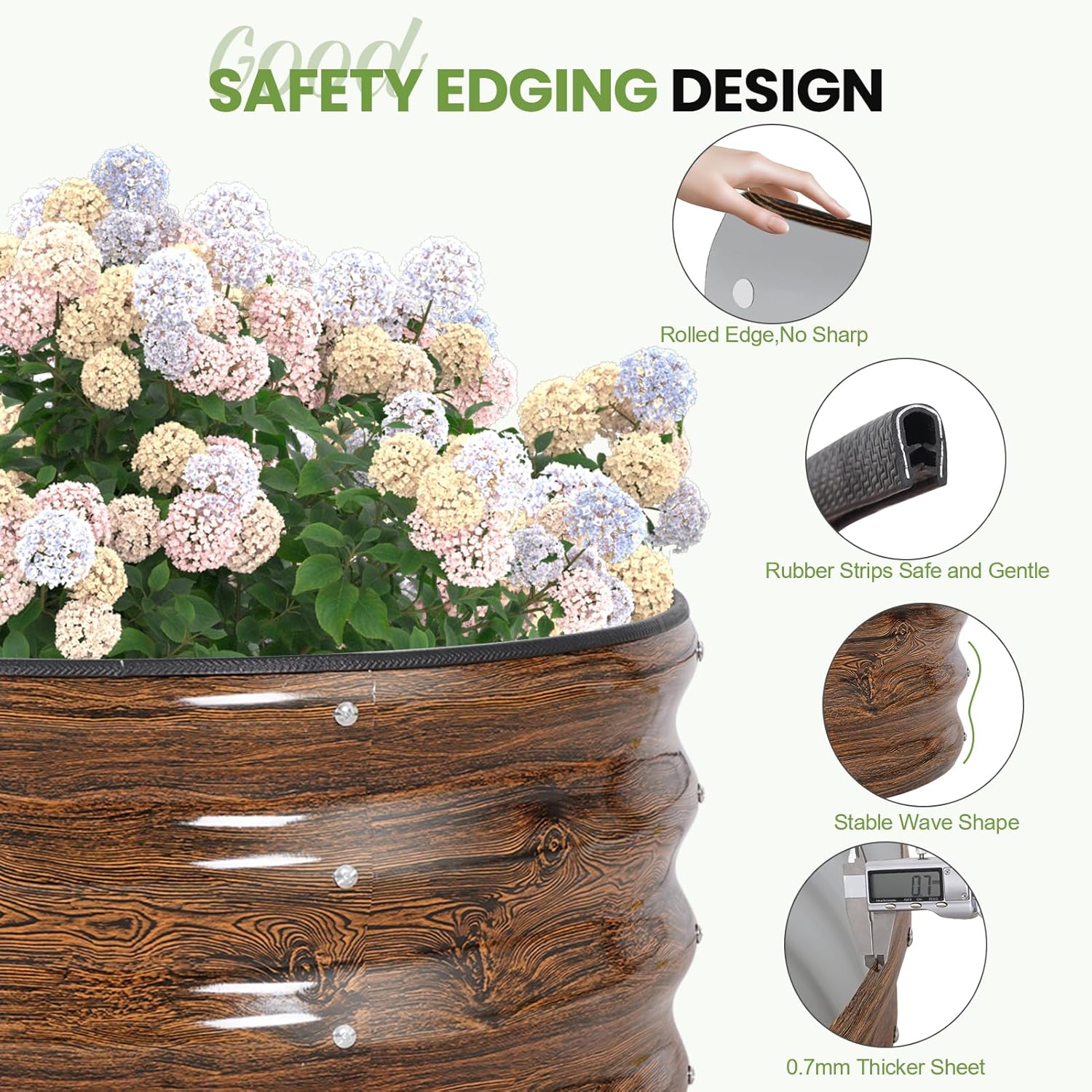- 【Safe Edge & Rubber Trim】 The planter raised beds features a rolled top edge with a rubber strip to prevent injuries during setup and gardening. This thoughtful design enhances safety, especially for families with children and pets.
