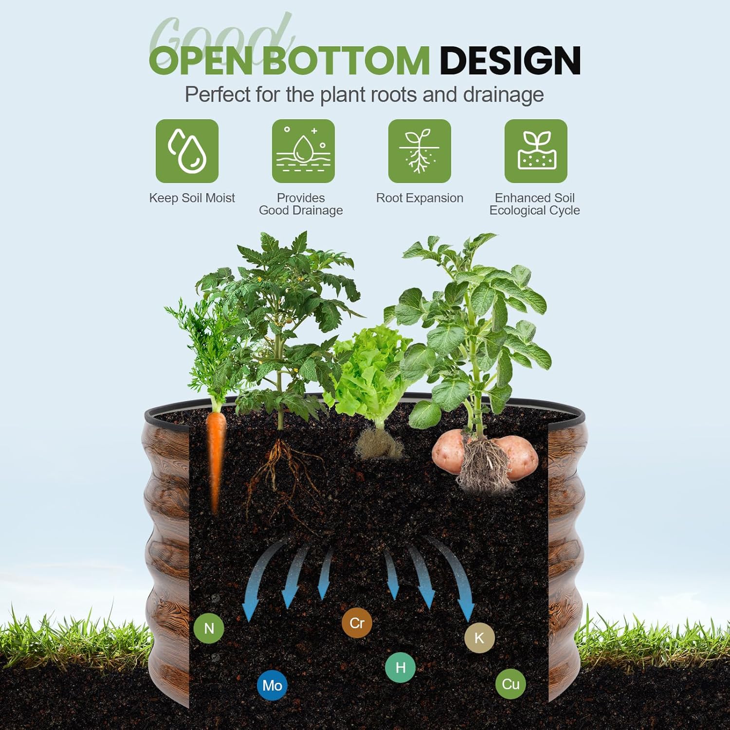 - 【Open Bottom Design】 The above ground garden bed feature an open base, promoting excellent drainage and aeration. This allows roots to grow freely, creating an ideal environment for healthy growth and abundant harvests.