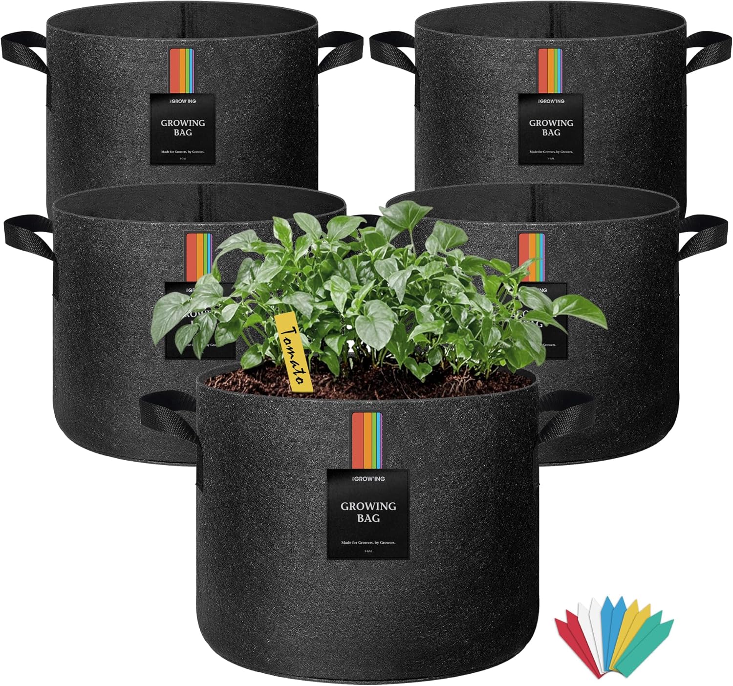 The Growing 5 Pack 5 Gallon Fabric Grow Bags,Thickened Aeration Nonwoven Fabric Plant Pots with Durable Handles,Heavy Duty 300G Planter Pot for Tomato, Fruits, Vegetables and Flowers, Black