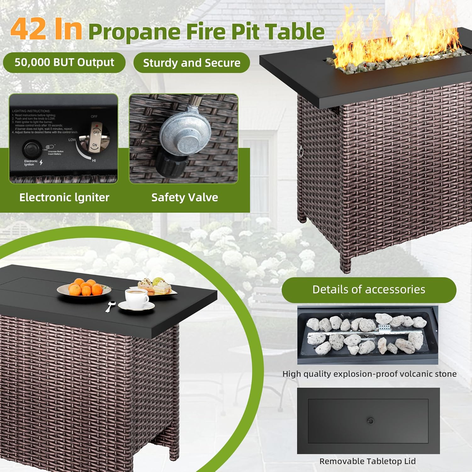 - COMPLETE SET: 6-piece outdoor sectional includes a 2-seated sofa, two single sofas, a 3-seated sofa, a fire pit, and plush cushions for comfortable seating of 7 people