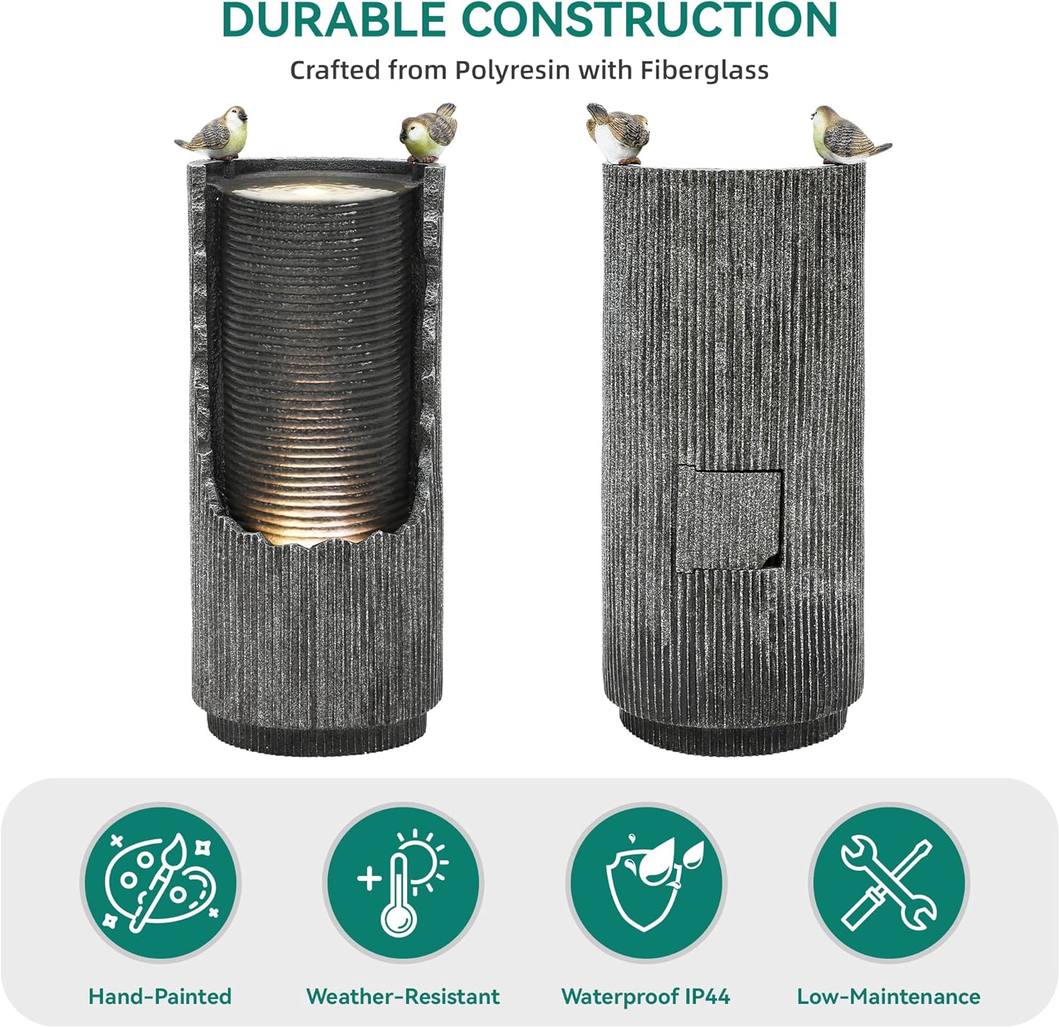 - DURABLE CONSTRUCTION: Made from premium resin and fiberglass with a handcrafted finish and 3D textures, this outdoor fountain is weather, rust, and scratch-resistant. It offers lasting beauty with low-maintenance, making it a perfect addition to your outdoor décor year-round.