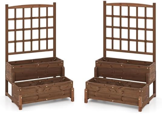 HAPPYGRILL Raised Garden Bed with Trellis, Drainage Holes, 2-Tier Wooden Elevated Planter Box w/Legs for Climbing Plants Vine Flower Herb Vegetable Fruit, Outdoor Garden Box for Patio Balcony (2)
