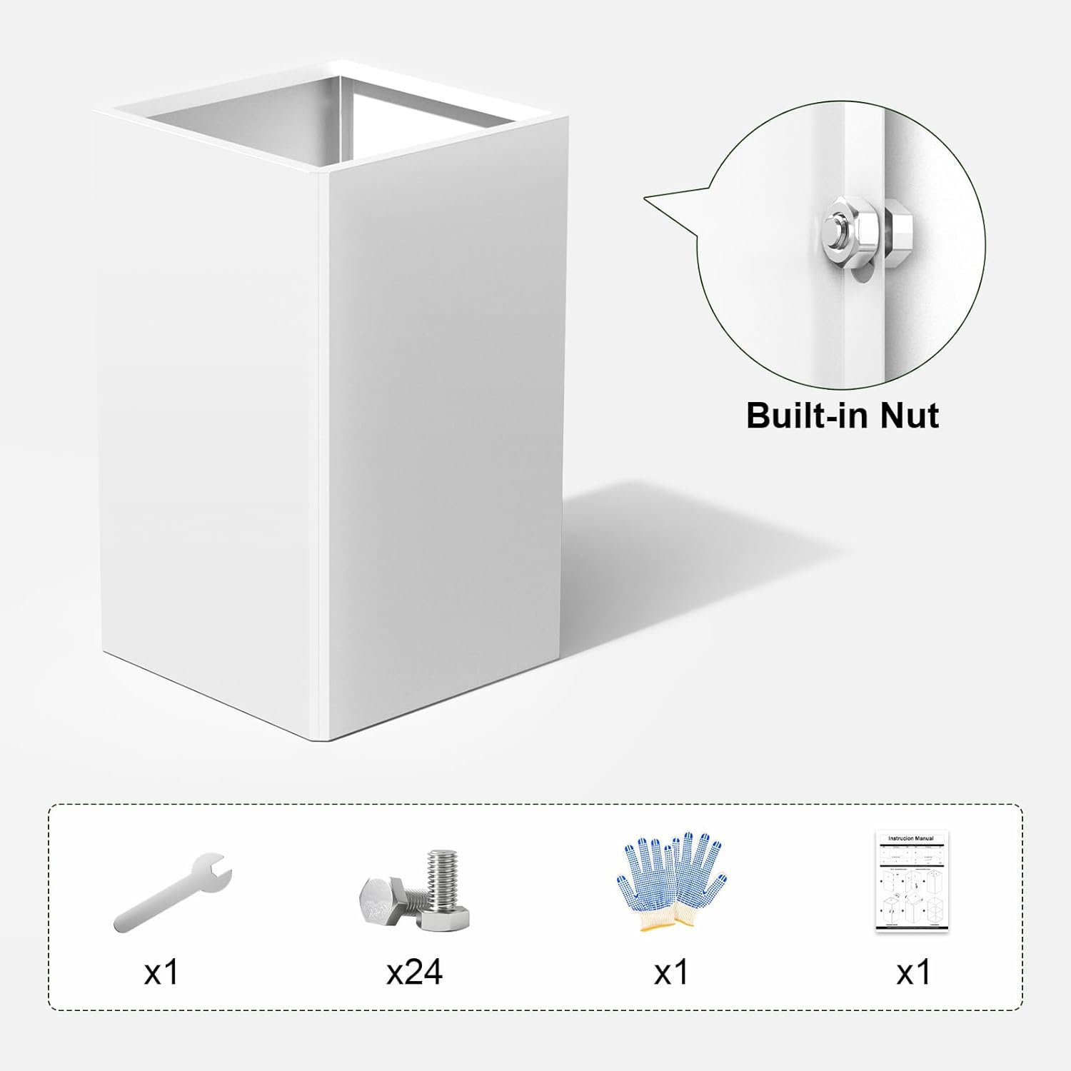 - White & Tall Metal Planter - 14" L x 14" W x 24" H, The tall planter box is equipped with 24 screws, a wrench, protective gloves and instructions. Note: This large metal outdoor flower pots needs to be assembled