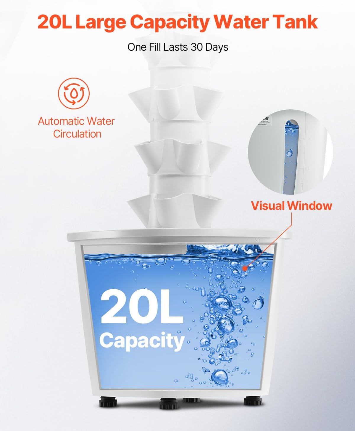 - Large Capacity Water Tank: The 20L water tank requires only one refill per month. With a transparent water level window, you can easily monitor the water level. The DC micro-pump (7W, quiet operation) provides a 600L/H flow rate and 2m/6.56ft lift height, ensuring continuous water circulation to supply oxygen to plant roots and reduce water waste.