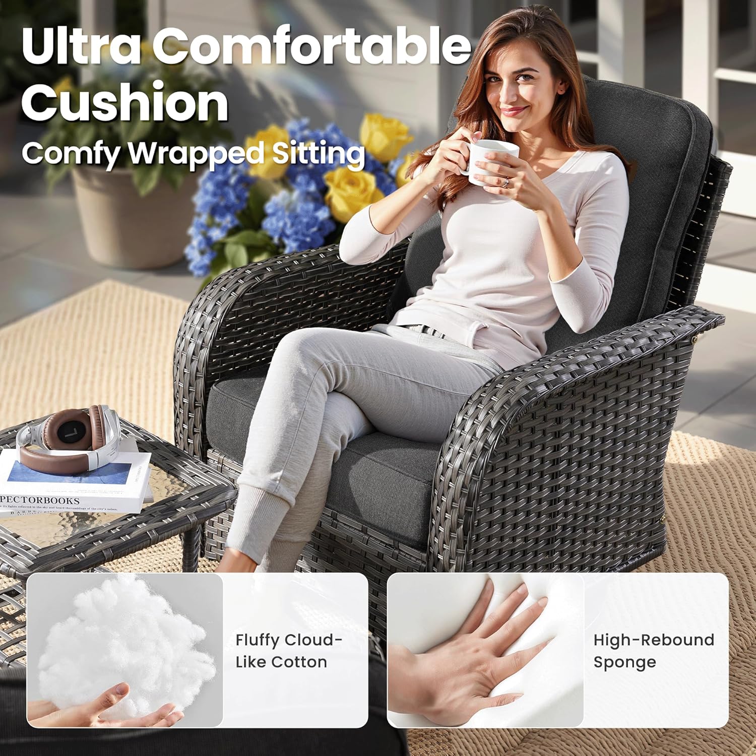 - Rocking Swivel Chairs: The fully rotating patio chairs allows you to 360 degrees swivel and 30 degrees rocking smoothly and silently. The unique forward and backward swing design allows you to easily enjoy a comprehensive comfortable experience, whether it's gathering, reading, or relaxing, you can find the most comfortable angle