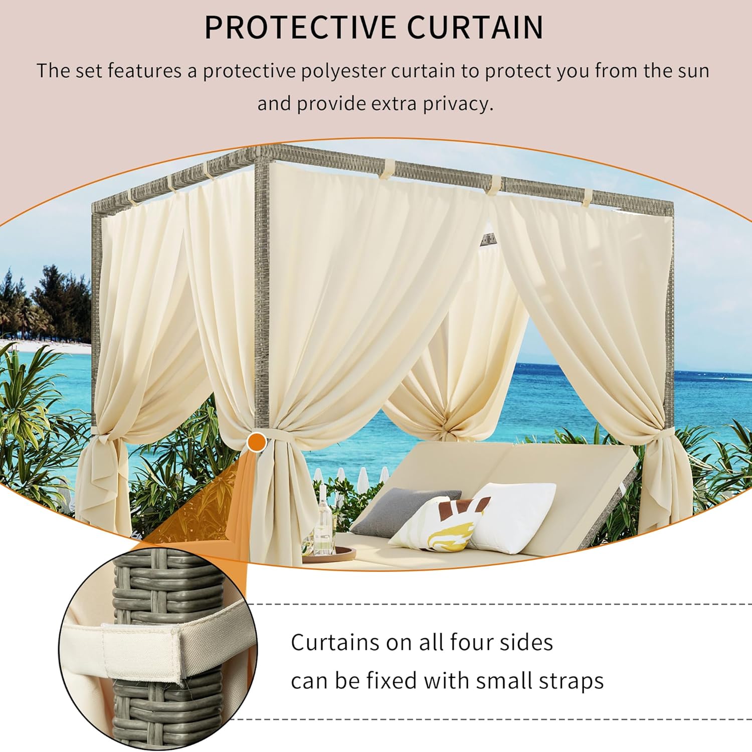 - Elegant & Private Outdoor Furniture:This chic rattan sunbed features both side and overhead curtains, offering a perfect combination of shade and privacy. It's an ideal addition to your balcony, garden, backyard, or poolside, providing comfort for 2 to 6 people to relax and enjoy quality time together.