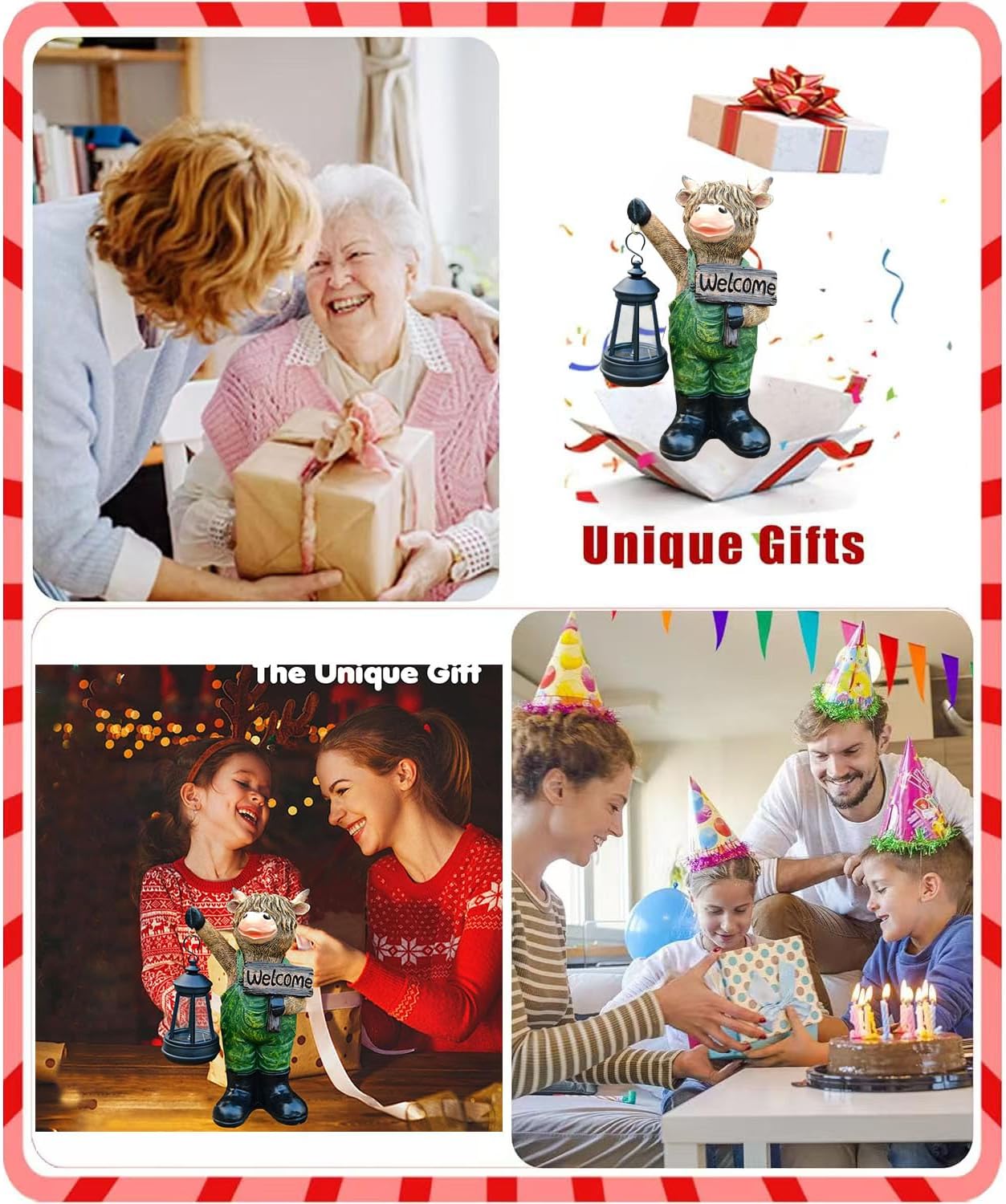 - 【Charming Cow Statue Design】 Features a playful cow figurine wearing green overalls, holding an LED lantern in one hoof and a "WELCOME" sign in the other, with vivid facial details for whimsical outdoor charm.