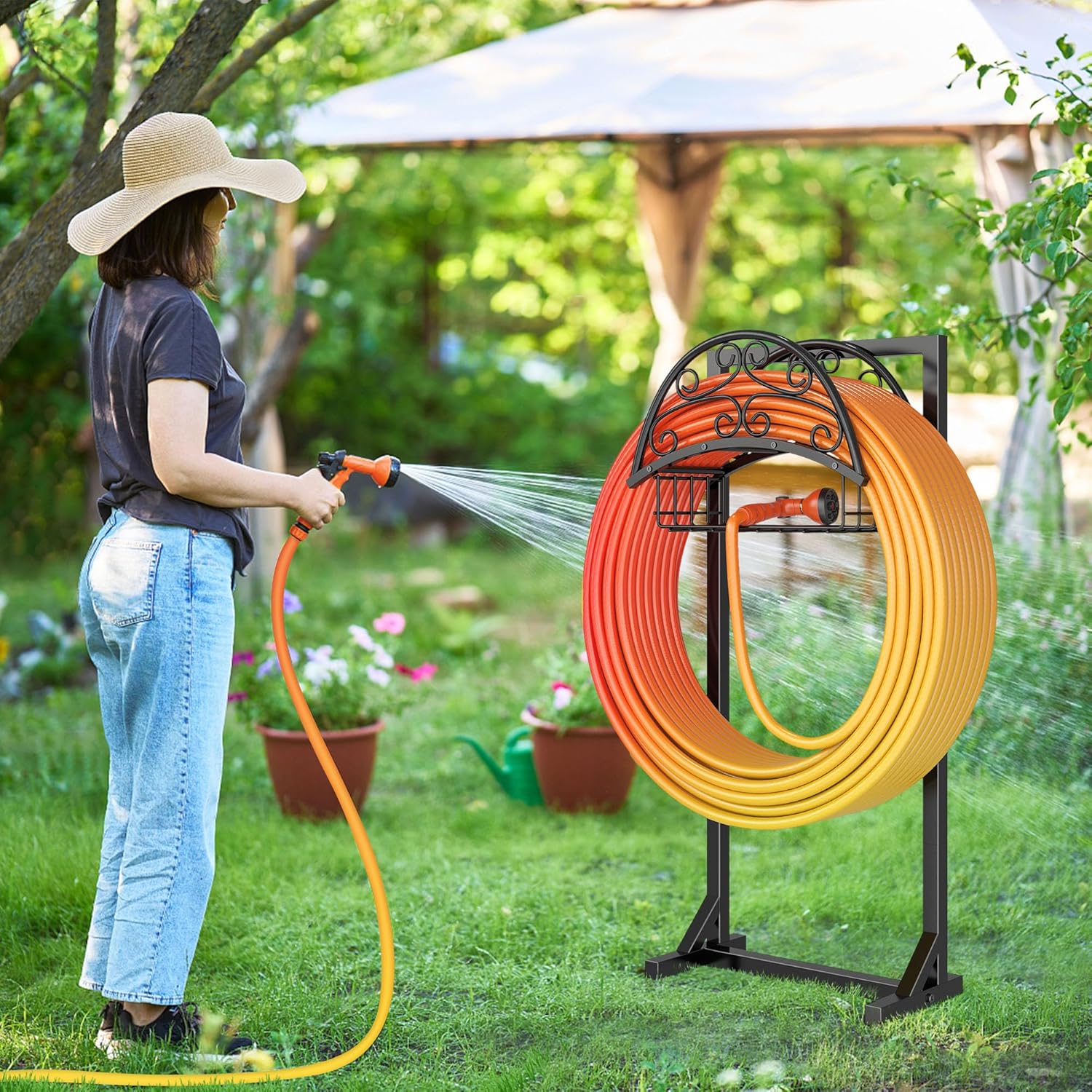 - 【Multipurpose & Portable for Any Outdoor Space】Ideal for gardens, patios, lawns, and courtyards, this hose organizer offers both functionality and portability. Its freestanding design makes it easy to relocate, giving you flexible placement options without the need for wall mounting.
