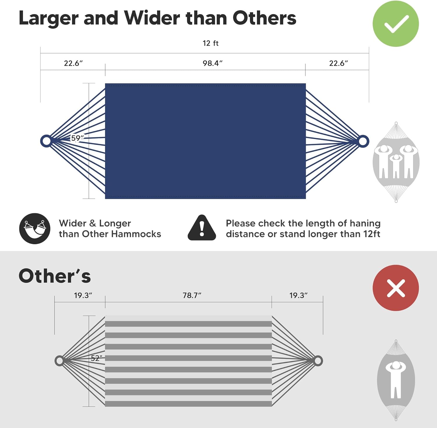 - Larger Bearing Capacity: The heavy duty hammock's total length (from loop to loop) is 144 Inches while the bed size is 98”long X 59”wide, making it perfect for couples