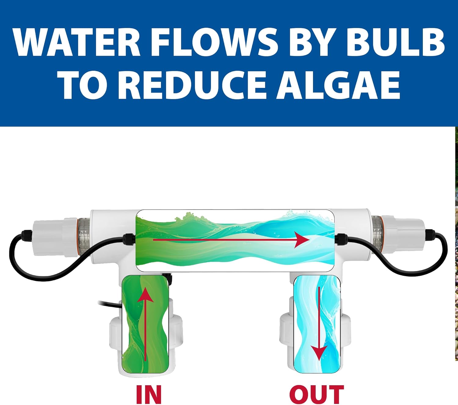 - Eliminate Green Water Caused by Planktonic Algae -- Green water is a thing of the past with this powerful unit. Passing water receives maximum UV exposure when forced by a high-output T8B bulb.