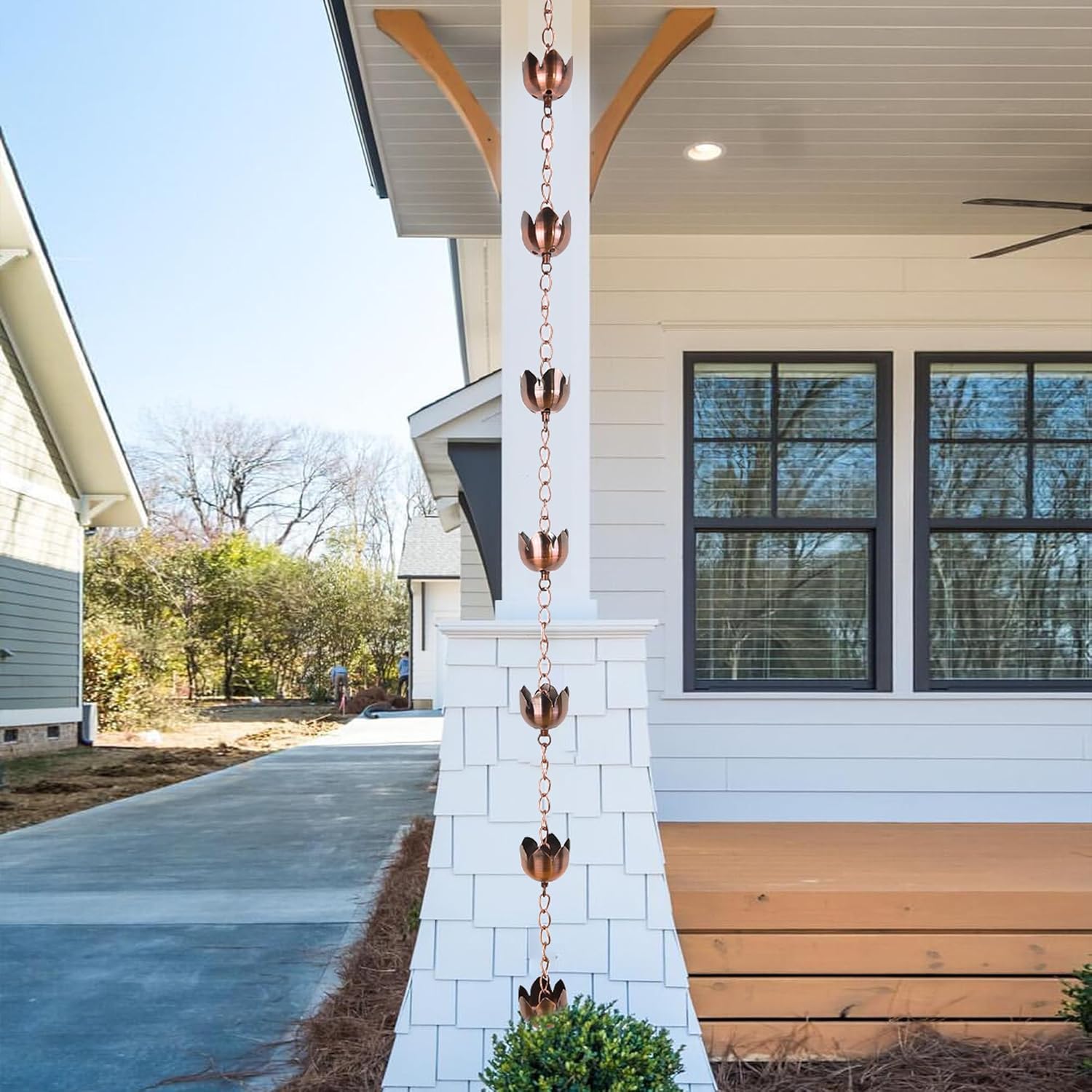 - 【Appearance of The Rain Chain】This rain chain can be used to decorate any of your outdoor scenes, including gardens, balconies, verandas, and has a vintage-glam look. This rain chain is 5.8 feet length and assembled from 11 copper-colored lotus cups. Each cup has a wide flare to capture most rainwater, and each size: 2.6" top opening, 2" high